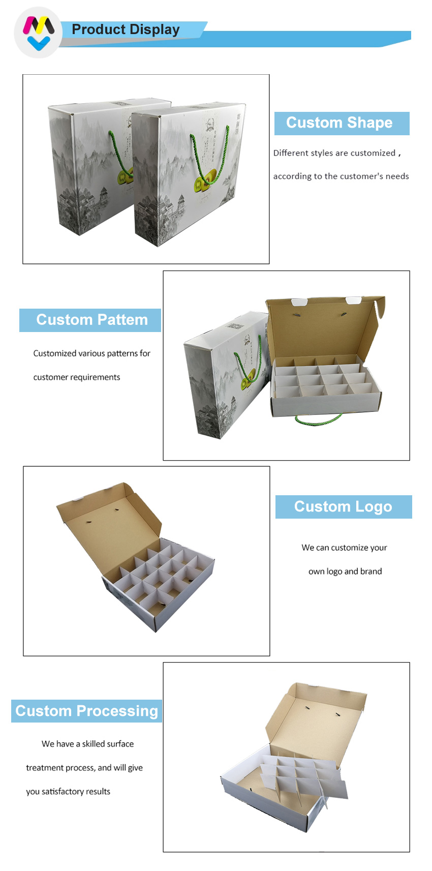 Toto je skládací poštovní krabice který vyrobila BE flute+ 250g CCNB Je to druh ovocného obalu s tvrdou kartonovou přepážkou, vnější strana v bílé barvě s vlastním vzorem a vnitřní strana krabice v přírodní kraftové barvě.