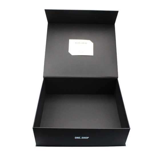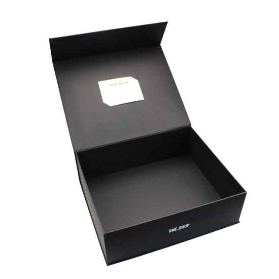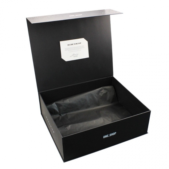 Toto je velká černá starožitná dárková krabička který dělal Černý papír + 1200g šedá lepenka s magnetickým zapínáním na klopu, bílé logo je vyraženo bílou fólií uprostřed víka, na vnější straně krabice je plný UV vzoru a uvnitř víka je připevněna malá obálka na jmenovku. Také můžeme vyrobit černý hedvábný papír na míru, který bude ladit s krabicí.
