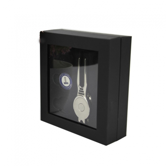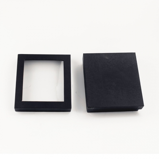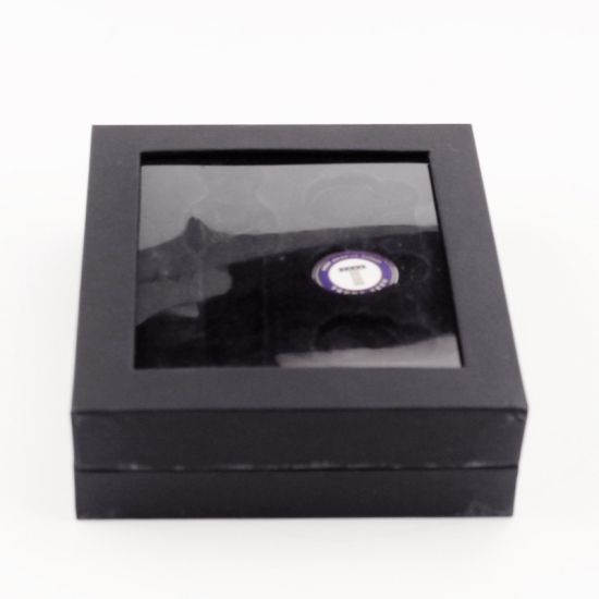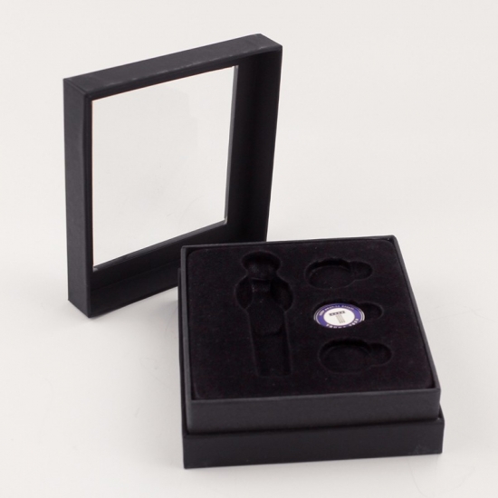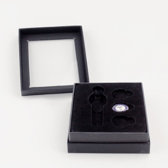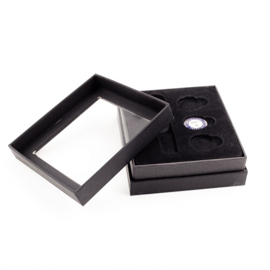 Jedná se o zakázkovou černou dekorativní kartonovou krabičku s průhledným PVC víkem, vyrobenou z černého speciálního papíru + 2 mm šedé lepenky, uvnitř je černá sametová látka pokrývající blistrovou vložku, díky čemuž vypadá velmi luxusně.