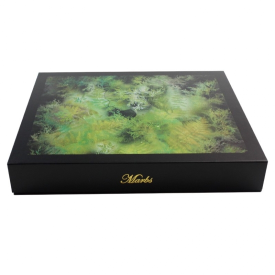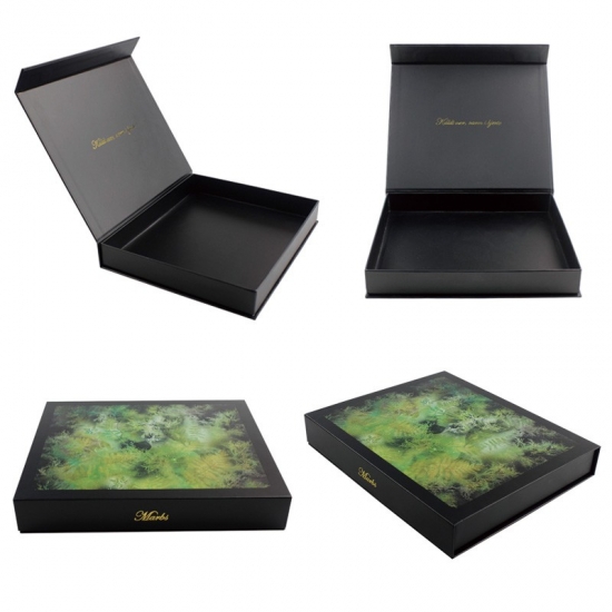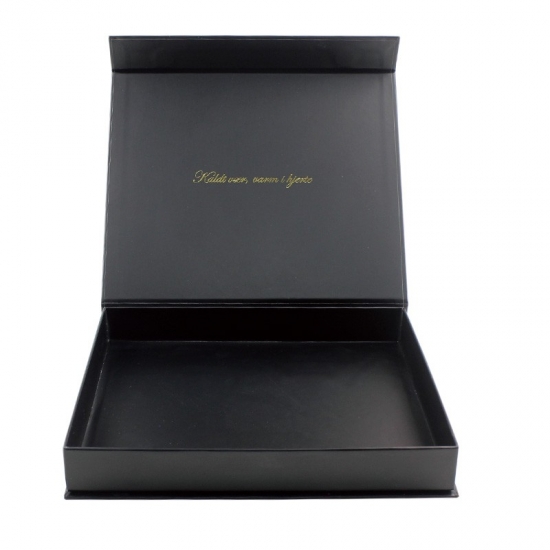 Jedná se o personalizovanou černou dárkovou krabičku s magnetickým zapínáním. který dělal Z uměleckého papíru C2S gramáže 157 g + šedé lepenky 1200 g, jedná se o dekorativní matnou černou krabičku, která je zvenku opatřena plnobarevným potiskem a logo uvnitř je vyraženo zlatou fólií.