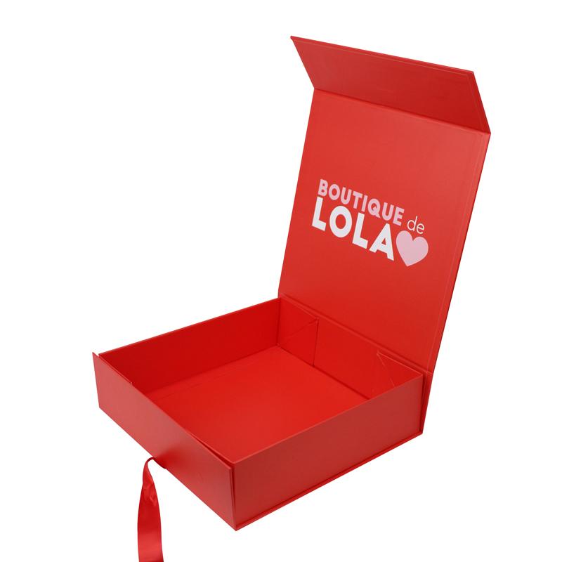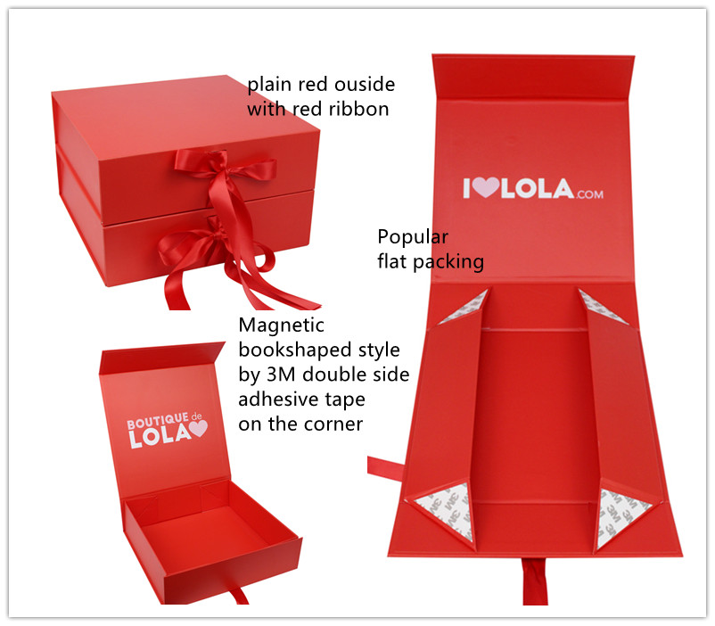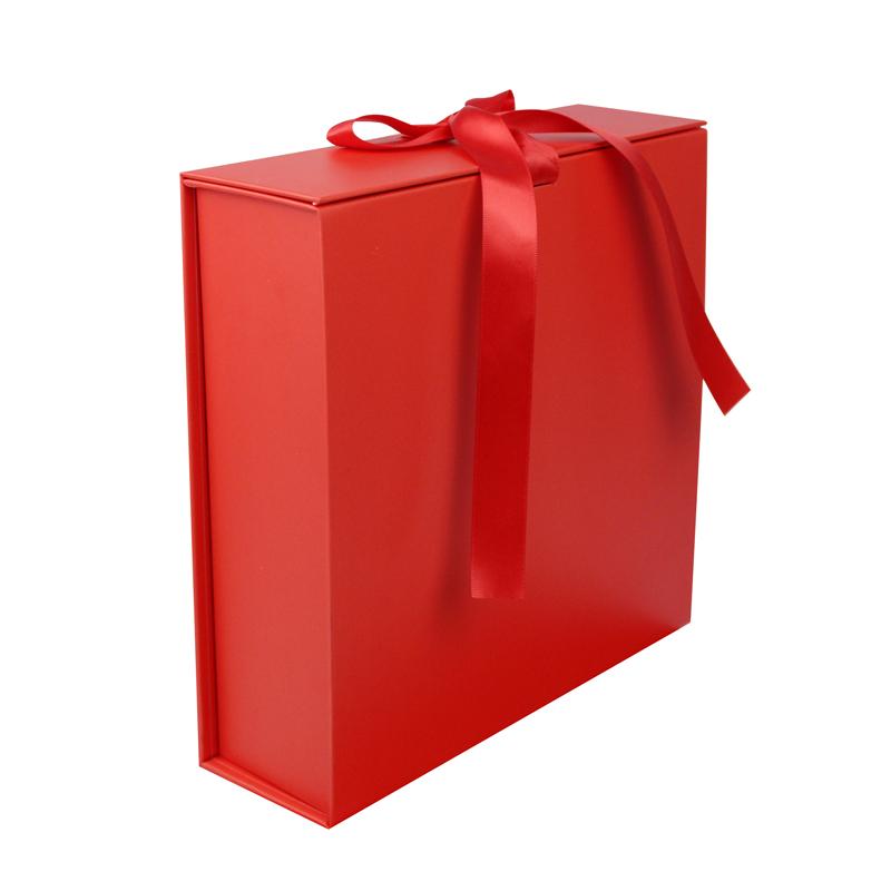 Klasický Krabička se stuhou a kravatou Vyrobeno z uměleckého papíru C2S s pevnou lepenkou o gramáži 1200 g/m², s magnetickým a páskovým zapínáním. Vnější povrch je hladký červený. Uvnitř víka je logo na míru, které vás nutí přemýšlet, co je uvnitř za produkt. Na rohu jsou použity samolepky 3M, můžete je použít jako standardní magnetické krabice ve tvaru knihy.