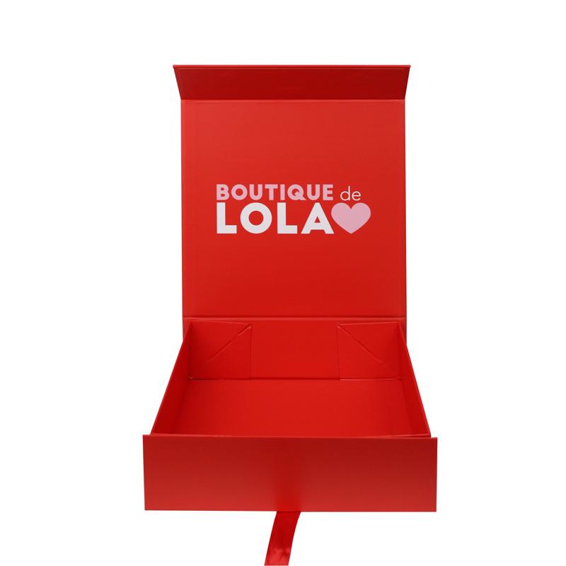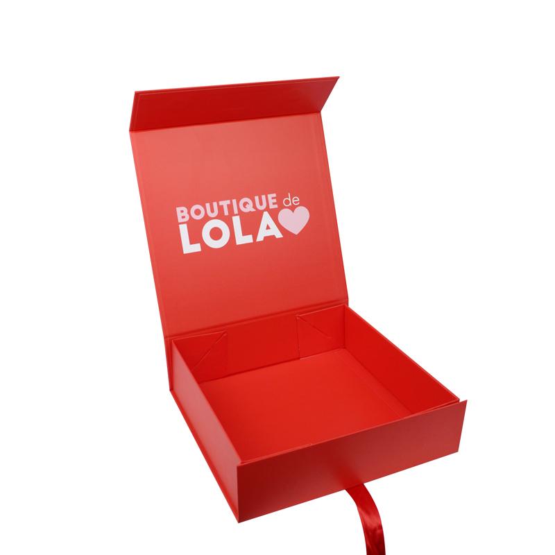 Skládací papírová krabice ve tvaru knihy s červenou magnetickou stuhou s potiskem na zakázku