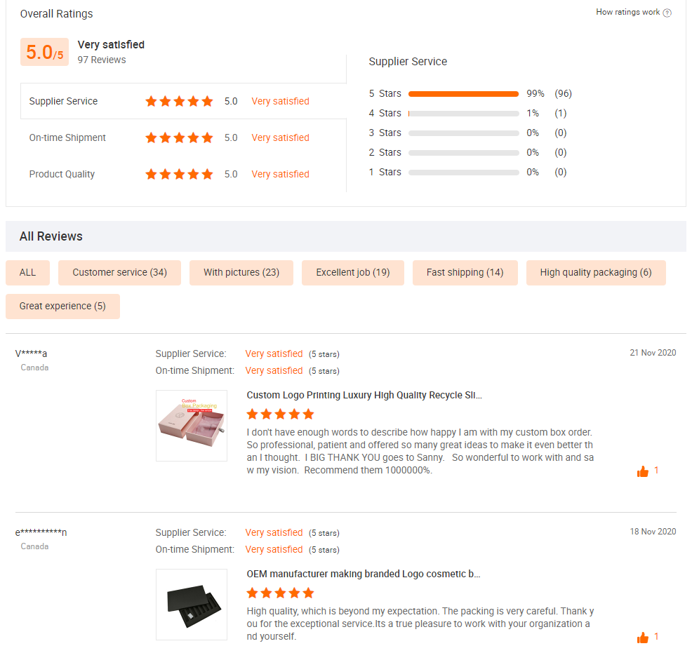 Během každého procesu přísně kontrolujeme případné problémy. A před balením máme profesionální pracovníky kontroly kvality, kteří krabice zkontrolují, aby se ujistili, že nemají žádné takové problémy. Za všechny krabice, které jsme dosud vyrobili, jsme od klientů získali mnoho vysoce hodnocených recenzí.