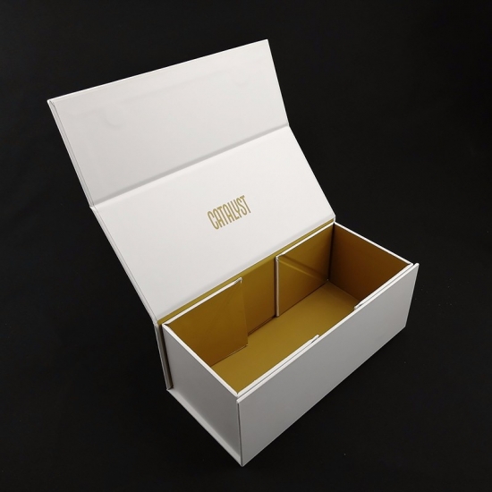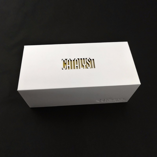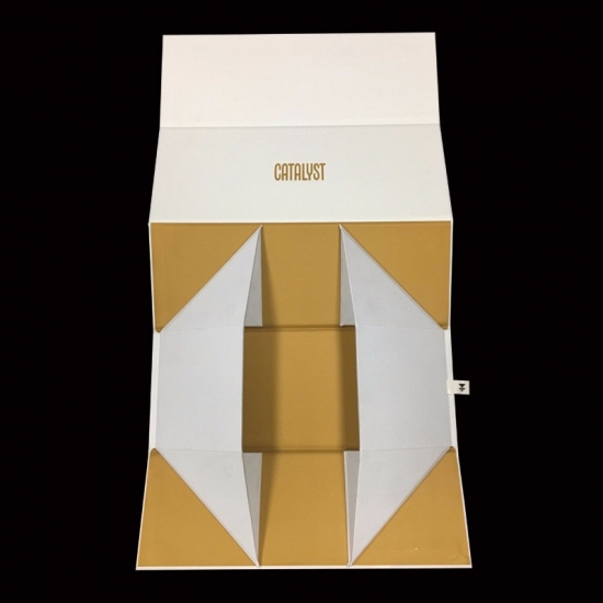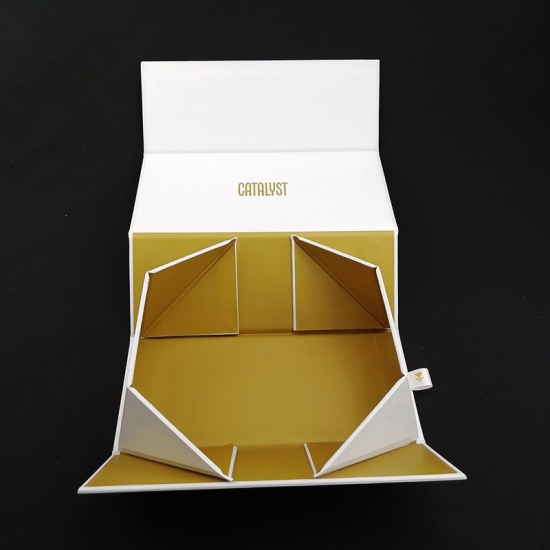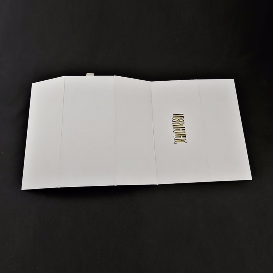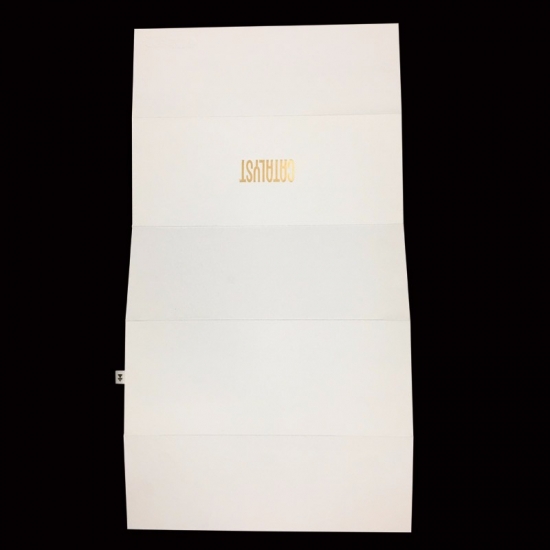 Vyrobeno ze speciálního papíru + 2mm šedé lepenky, vně bez potisku, uvnitř plný tisk přímými barvami a ražením loga, zlatá ražba za tepla.