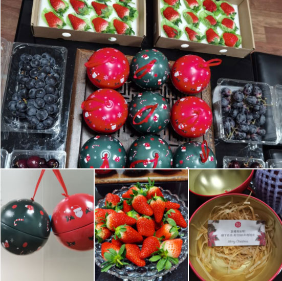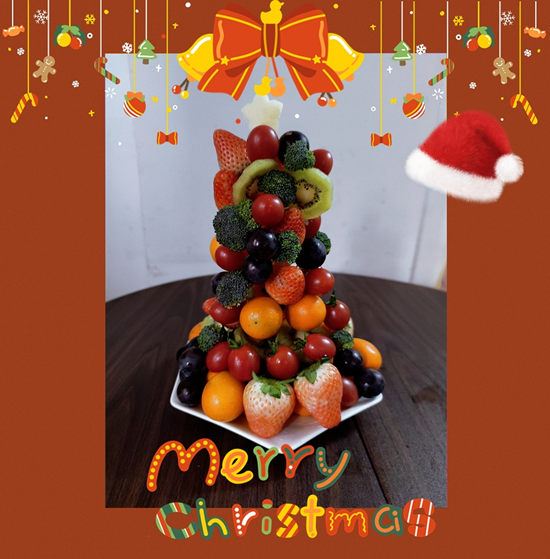 V tento zvláštní den se členka našeho týmu Sandy rozhodla vyrobit speciální vánoční stromeček z ovoce. Doufá, že lidem, které miluje, přinese zdraví, štěstí a úspěch. Po dvoudenní pilné práci se jí ovocný vánoční stromeček podařilo postavit.