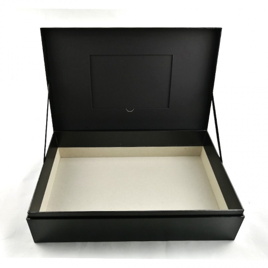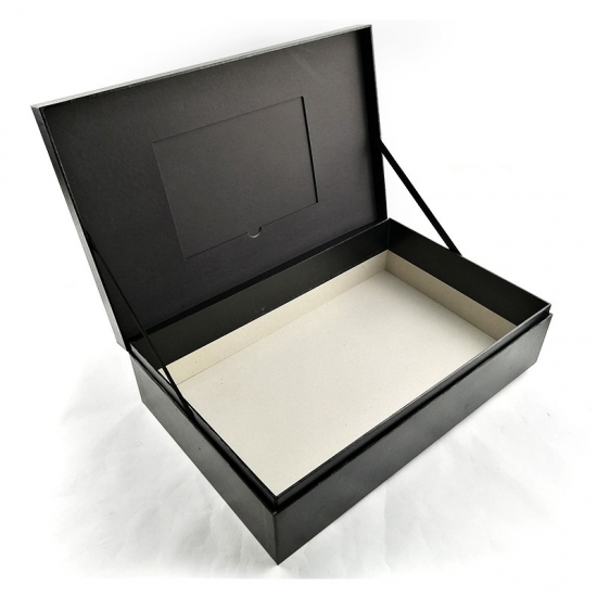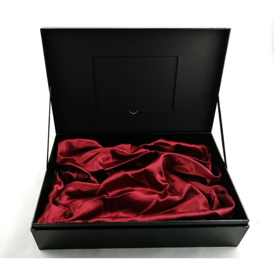 Toto je černá dárková krabička z mušle který dělal Logo na vnější straně krabice je vyrobeno z uměleckého papíru C2S gramáže 157 g + šedé lepenky 2 mm. Logo na vnější straně krabice je vyraženo stříbrnou fólií, která může krabici dodat luxusnější a jedinečnější vzhled. Vnitřní vložka krabice je z kvalitního saténu, který zdobí výrobky uvnitř krabice.