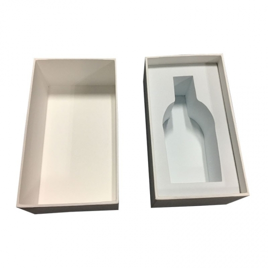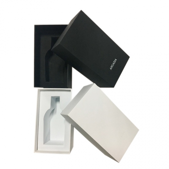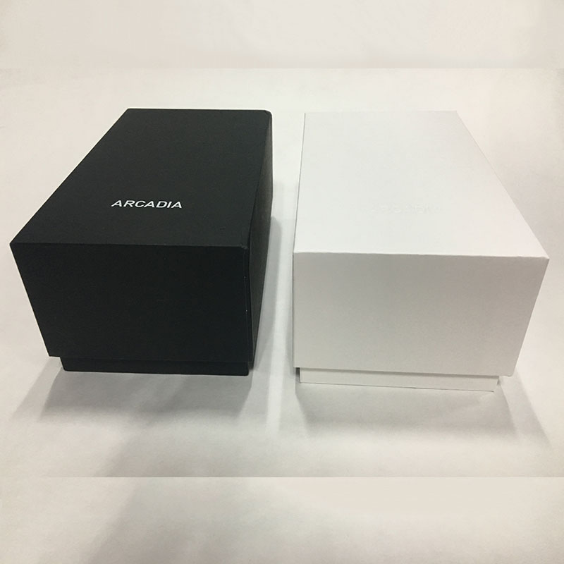 Toto je kosmetické krabičky s víčky který dělal z uměleckého papíru C2S gramáže 157 g + šedého kartonu o tloušťce 2 mm, bílé barvy s matnou laminací a černé barvy s logem vyraženým bílou fólií na víku.