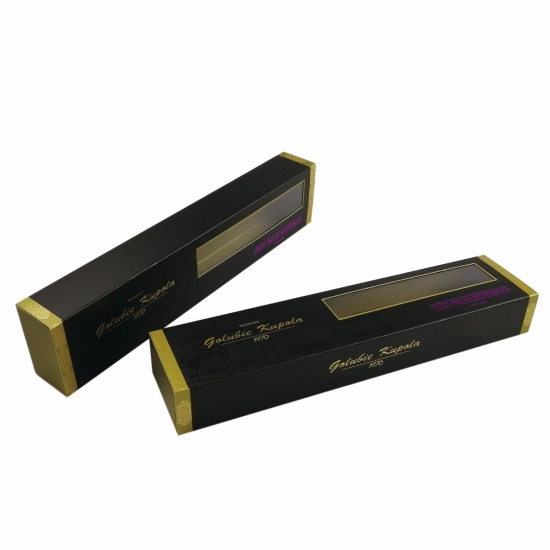 Je to skládací posuvná zásuvková krabice se zlatým základem který dělal z uměleckého papíru C2S 157 g + šedého kartonu 1200 g ,plné potisku na vnější i vnitřní straně krabice, jsou tam papírové kartonové vložky, které mají vlastní tvar podle produktů uvnitř krabice.