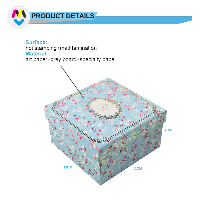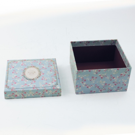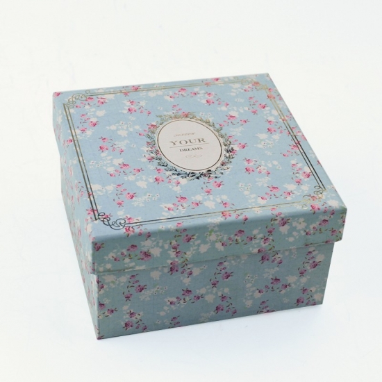 Toto je zakázková modrá čtvercová dárková krabička s romantickým květinovým vzorem, vyrobená z 157g uměleckého papíru C2S a 1200g šedé lepenky, LOGO zlatá fólie s horkou ražbou, uvnitř čistá červená dekorativní barva. Rozměry: 12x12x12 cm.