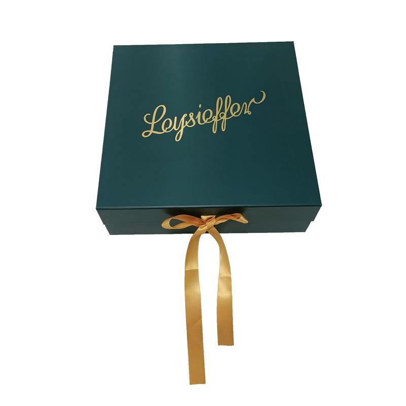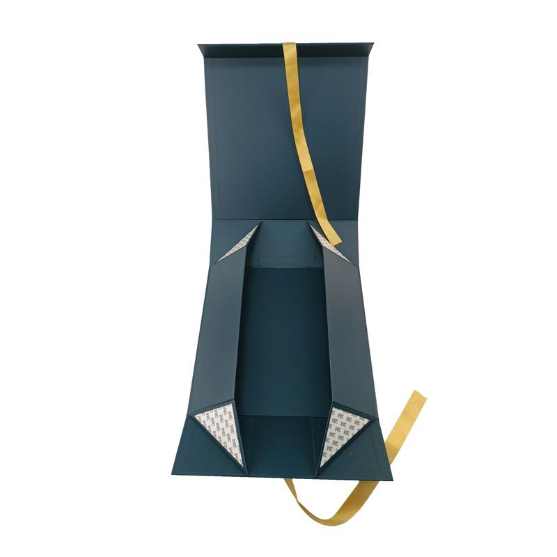 Luxus Magnetická skládací papírová krabice Vyrobeno z uměleckého papíru o gramáži 157 g/m², laminovaného pevnou lepenkou, po celé krabičce potištěno tmavě modrou barvou Pantone a s vlastním logem vytištěným v barvě Pantone Gold. Pro uzavření krabičky je vložen magnet i stuha, s lepicí páskou 3M na čtyřech rozích, která drží krabičku v dobrém stavu. Oblíbeně se používá k balení bot a dalších věcí. butikové dárkové balení .
