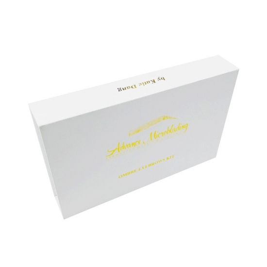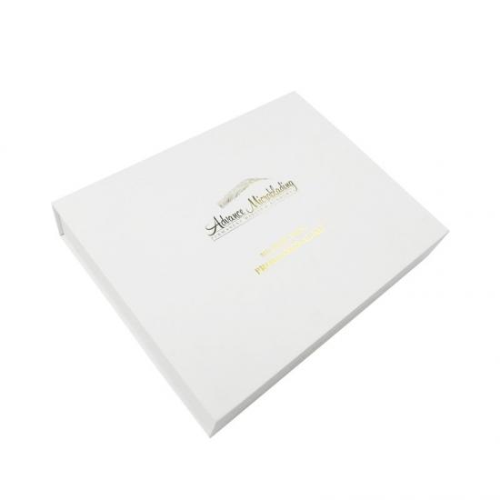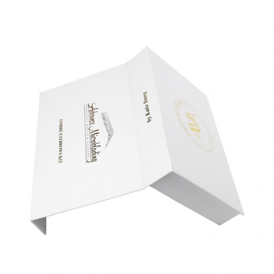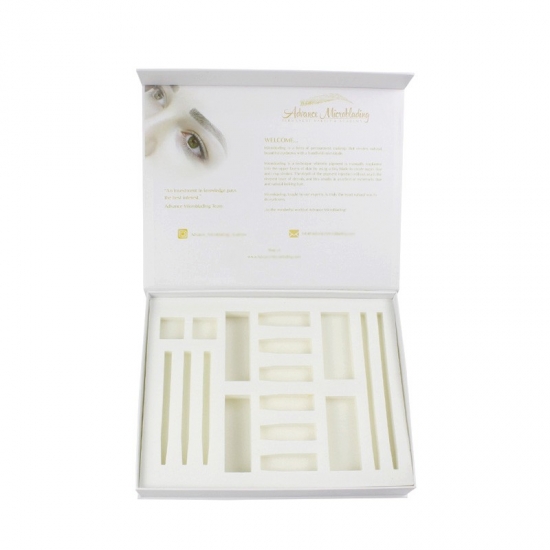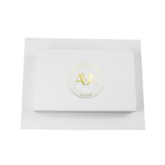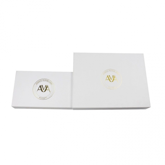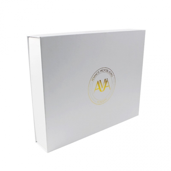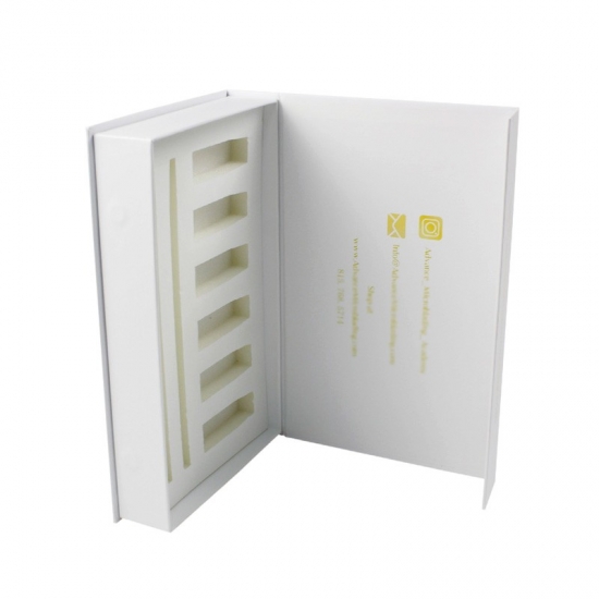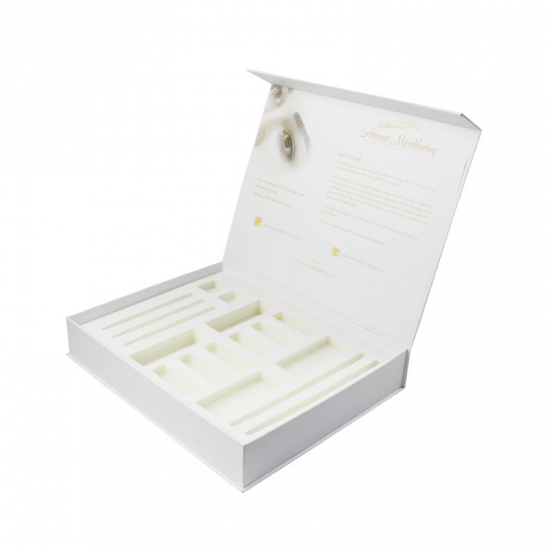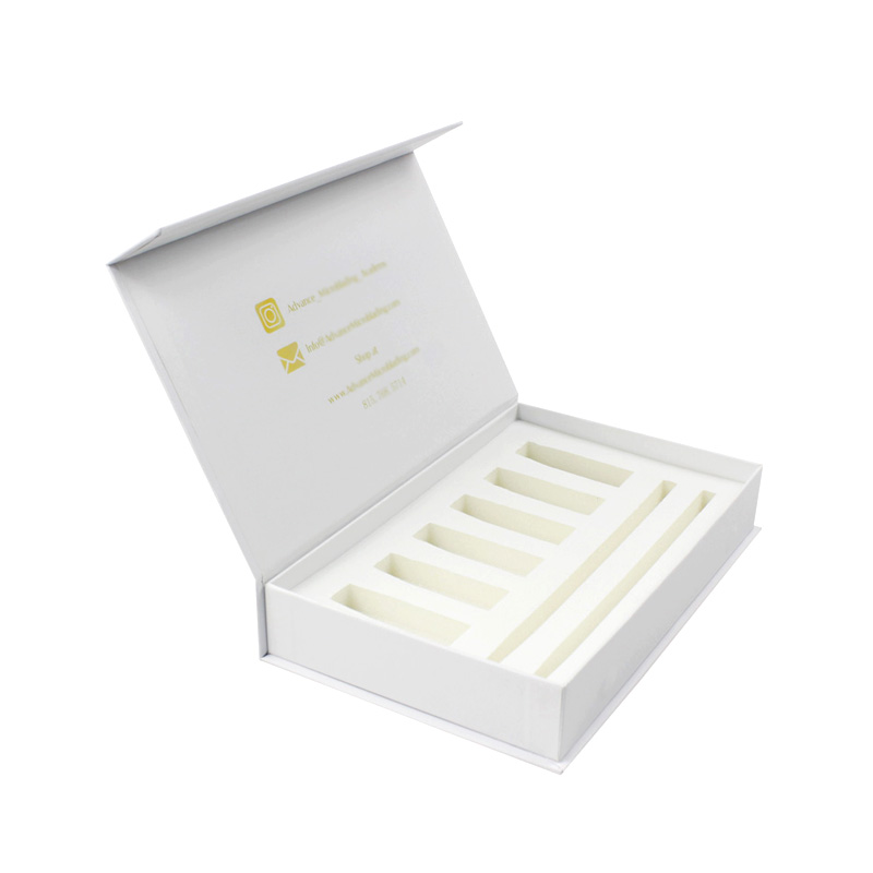 Toto je bílá magnetická balicí krabice s magnetickým zapínáním který dělal Logo na vnější straně krabice je vyrobeno z uměleckého papíru C2S 157g + šedé lepenky 2mm. Logo na vnější straně krabice je vyraženo zlatou fólií, která může krabici dodat lesklý a luxusní vzhled. Uvnitř krabice je houbička na míru potažená sametem.