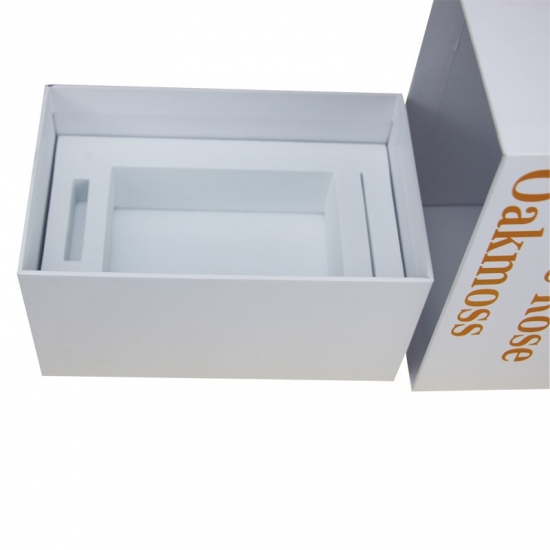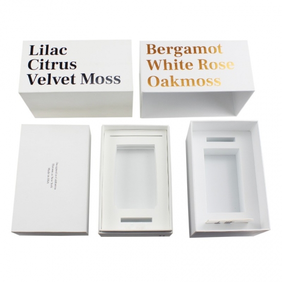 Toto je zakázkové víko a základna z kartonu s logem na svíčku ve zlaté fólii vyrobené z 157g uměleckého papíru C2S a 1200g šedé lepenky, uvnitř je ochrana z pěny EVA, která bude tvarována podle velikosti výrobků.