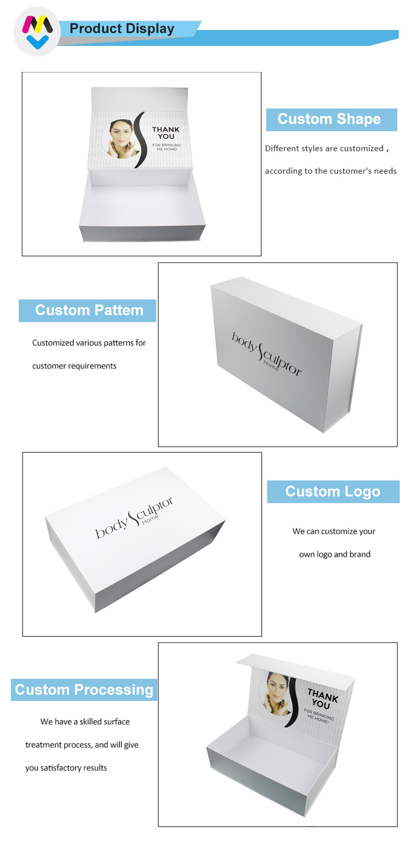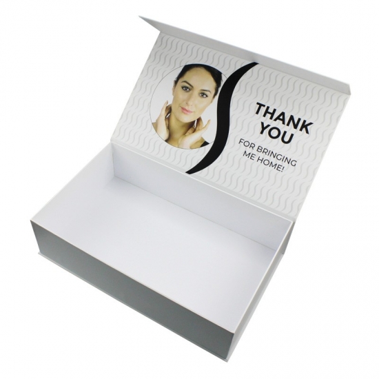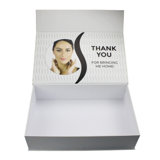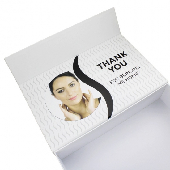 Velká magnetická dárková krabička na kosmetiku byla vyrobena z uměleckého papíru C2S o gramáži 157 g/m², laminovaného 2,5 mm šedou lepenkou, libovolné velikosti, jakékoli barvy a s osobním logem, povrchová úprava matná laminace, velikost 53,5*33*14 cm