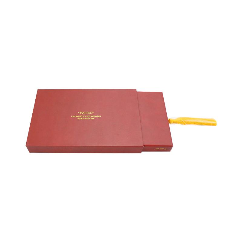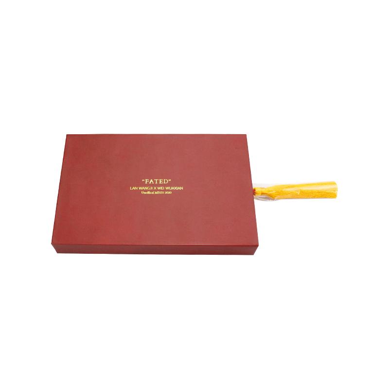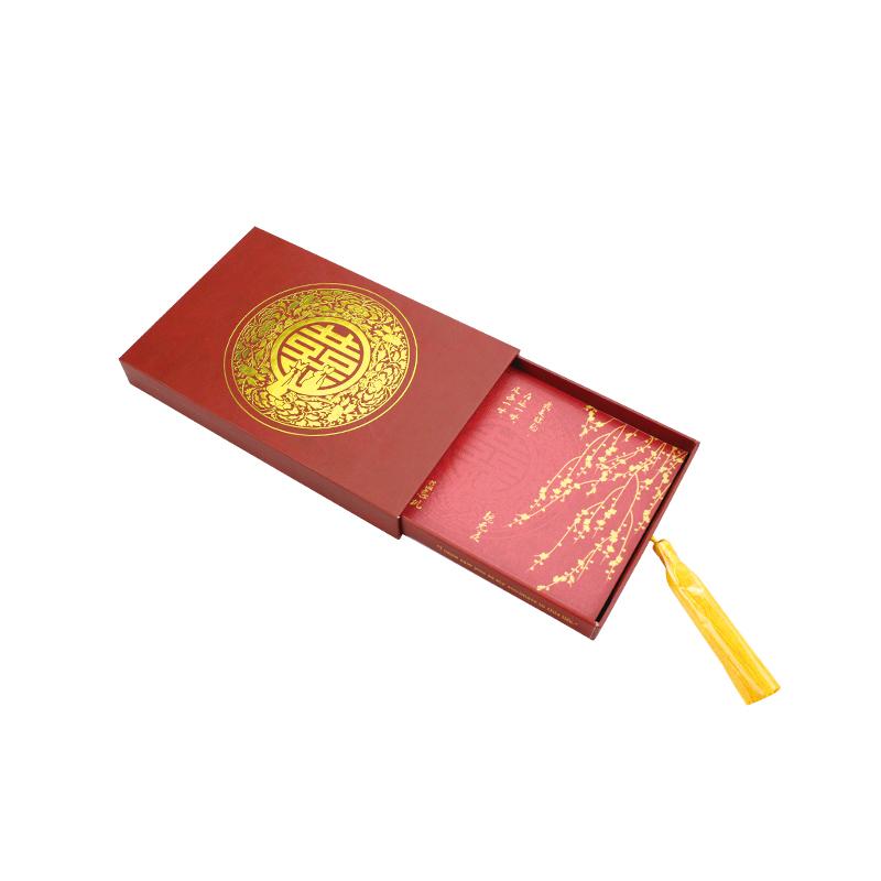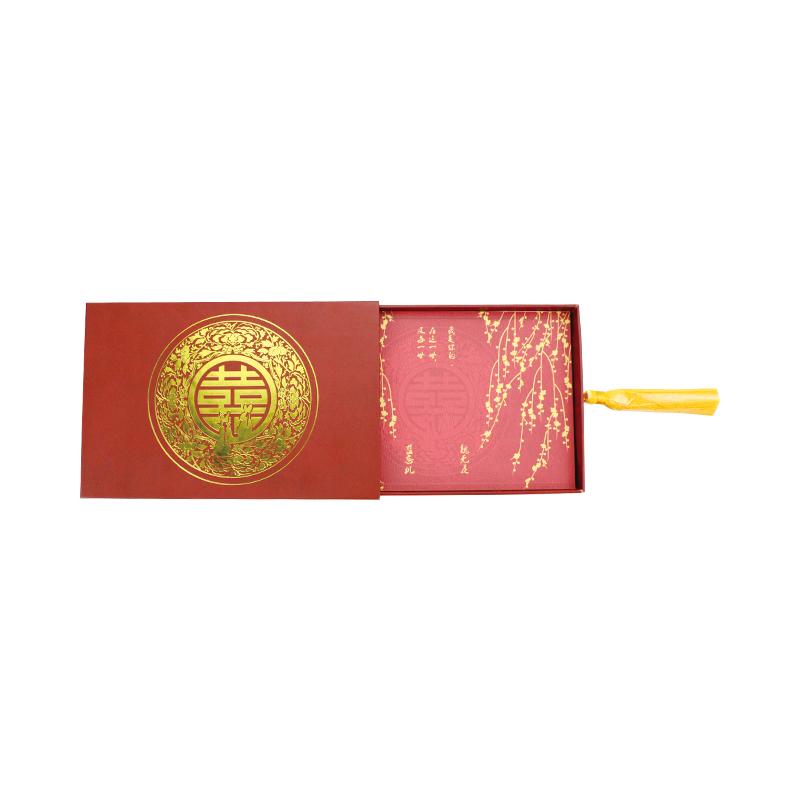 Jsme profesionální v zakázkové výrobě jakéhokoli druhu papírových krabic, papírových tašek a dalších papírových výrobků. Můžeme vám na míru vyrobit jakýkoli tvar, velikost, barvu, materiál, povrchovou úpravu a jakýkoli design. Tento produkt má obdélníkový tvar s plným potiskem s červenou barvou, zlatým logem s horkou ražbou a zlatou stuhou a matnou laminací. Obvykle se používá pro festivaly a svatební oznámení.
