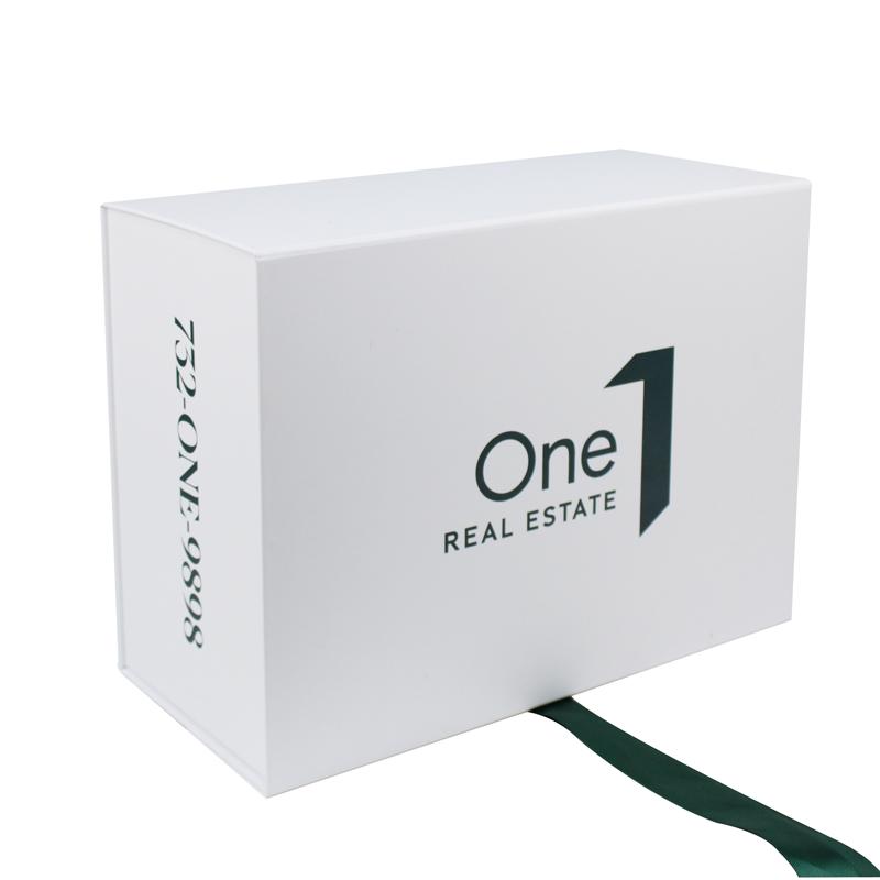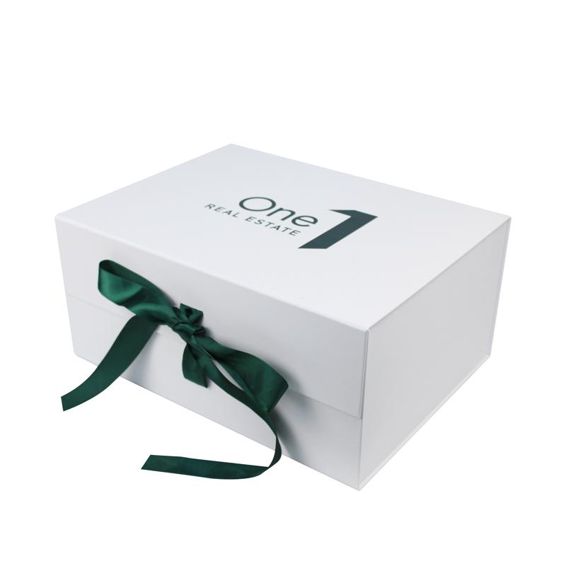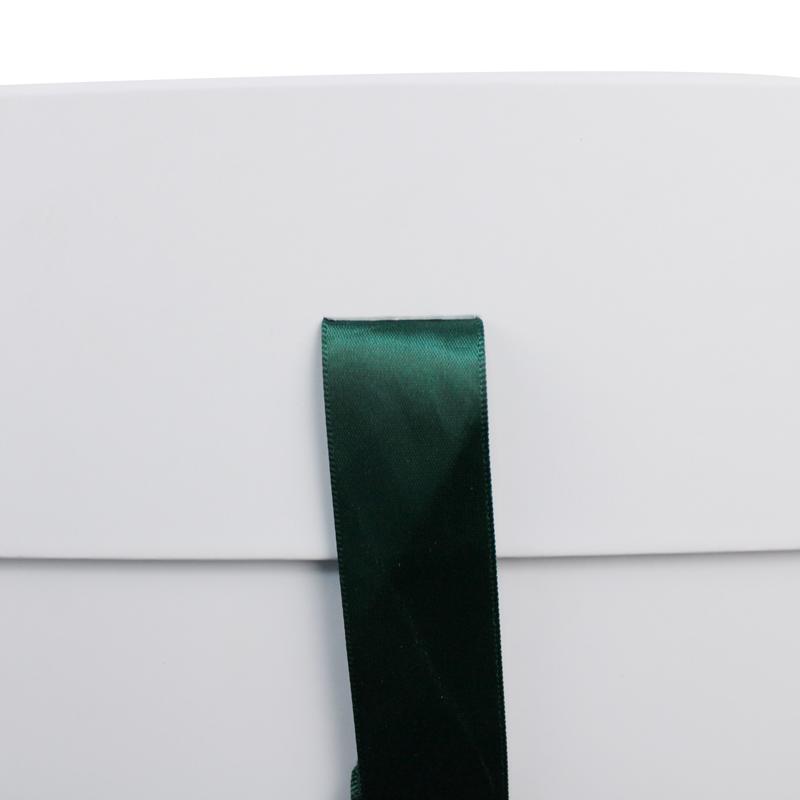 Klasický bílá dárková krabička se stuhou , vyrobeno z prémiového uměleckého papíru s fixací na pevném kartonu o gramáži 1400 g/m², Vlastní logo vytištěné v barvě Pantone zelené, se stuhou ve stejné barvě Pantone.