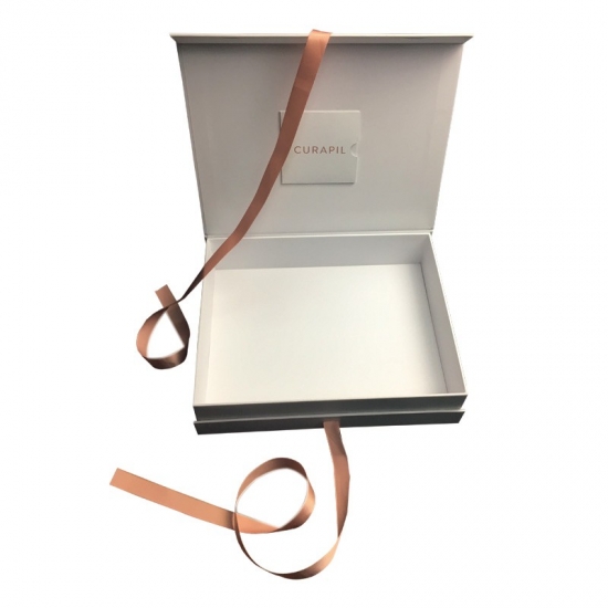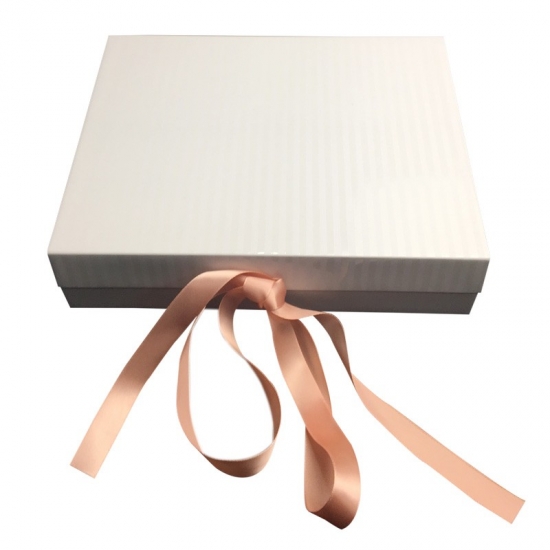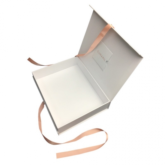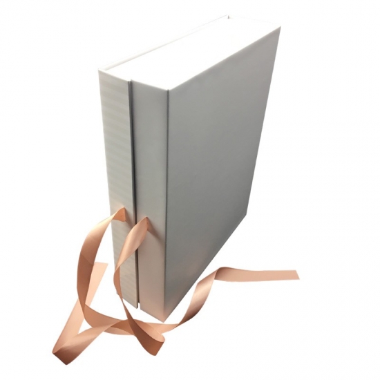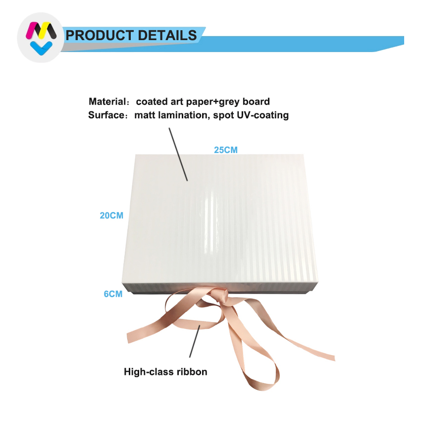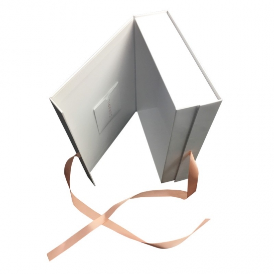 Bílá magnetická dárková krabička se stužkovým zapínáním byla vyrobena z 157gsm uměleckého papíru C2S laminovaného 2mm šedým kartonem s možností přizpůsobení stuhou v libovolné velikosti a barvě, povrchová úprava byla matná laminace a UV lakování.