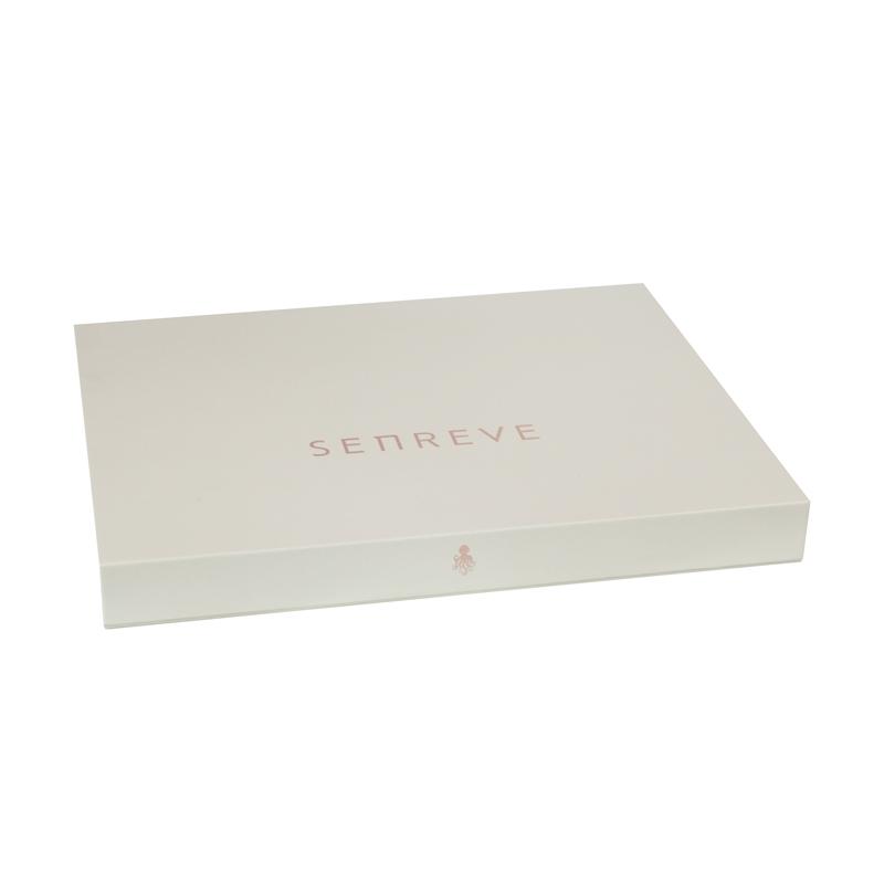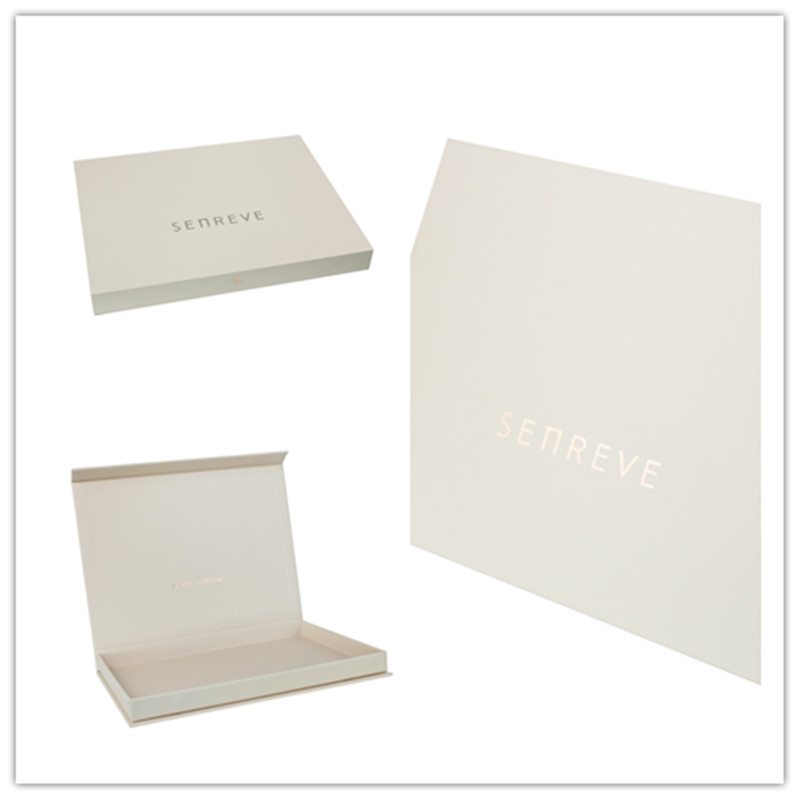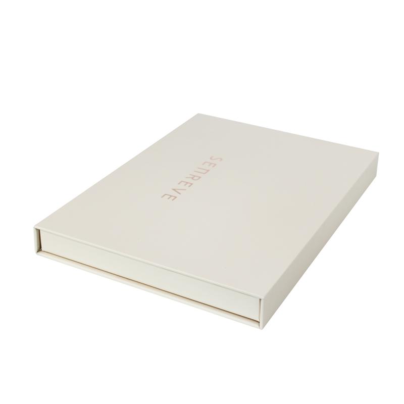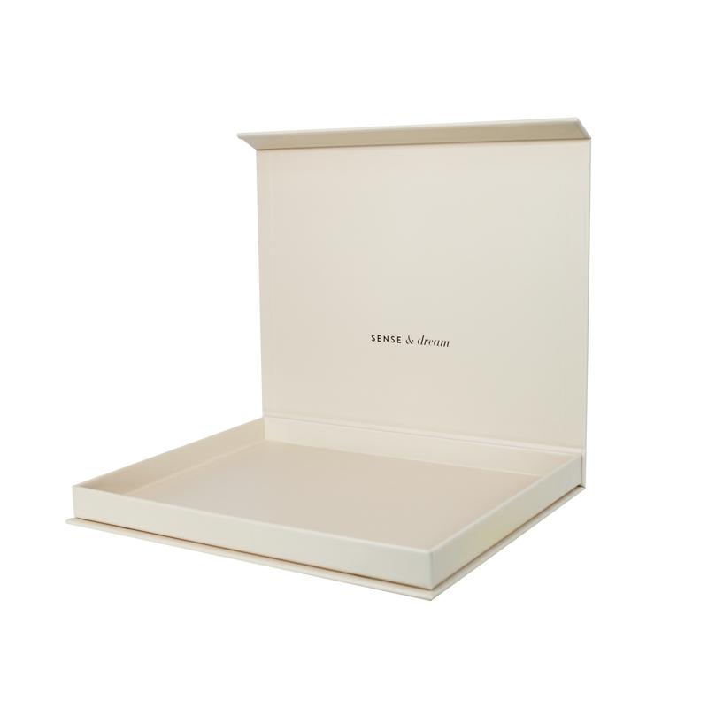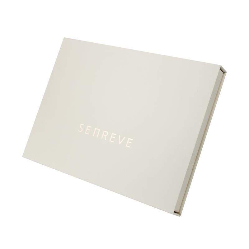 Tento Dárková krabice ve tvaru knihy je vyrobeno z uměleckého papíru o gramáži 157 g/m² laminovaného 2mm prémiovým šedým kartonem s pevným magnetickým zapínáním. Logo je vyraženo horkou ražbou ve světle růžovo-zlaté fólii. Jednoduché, ale klasické.