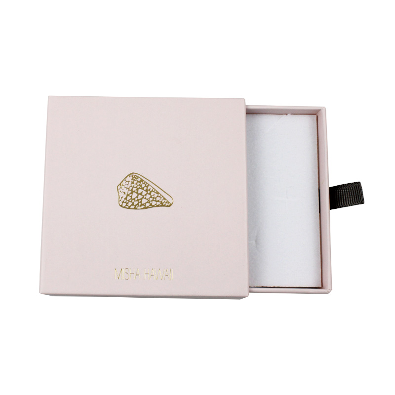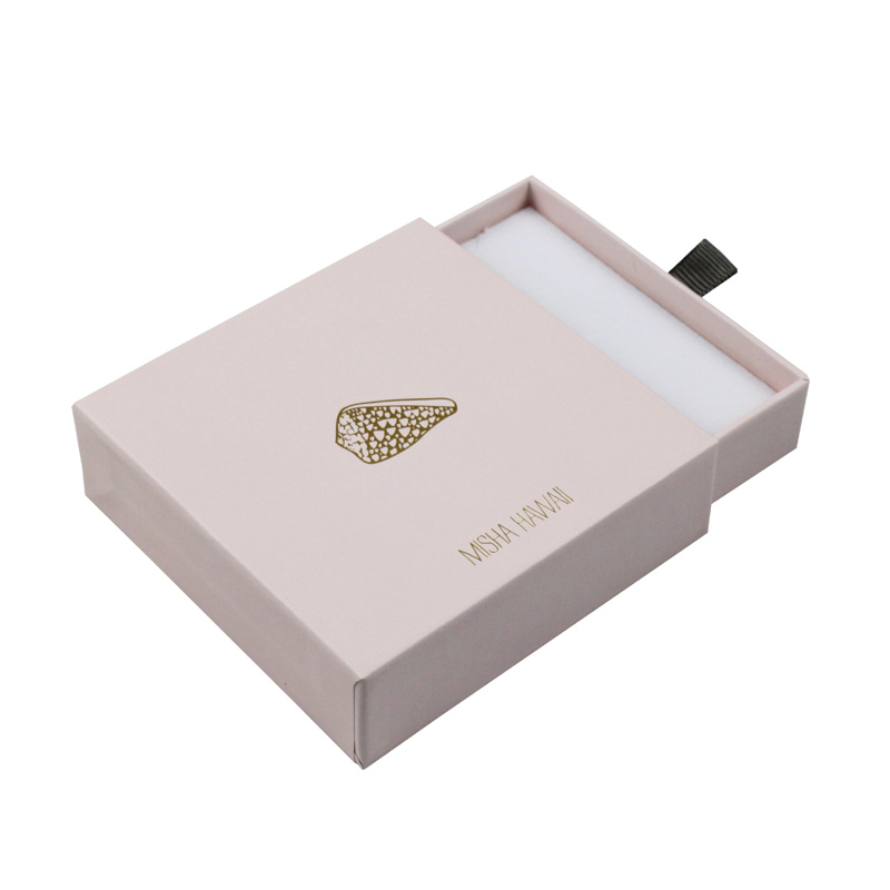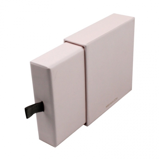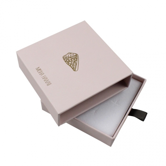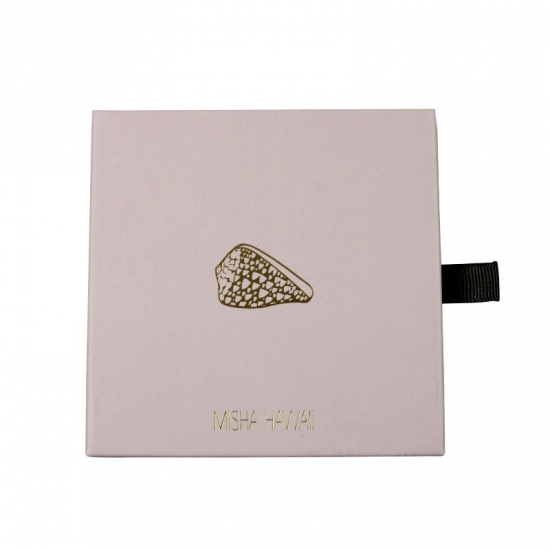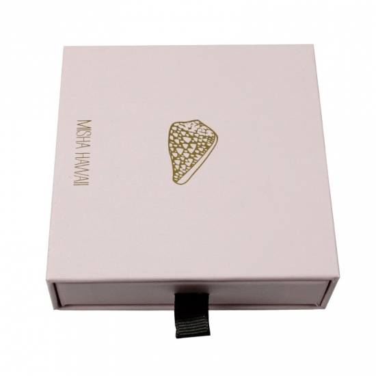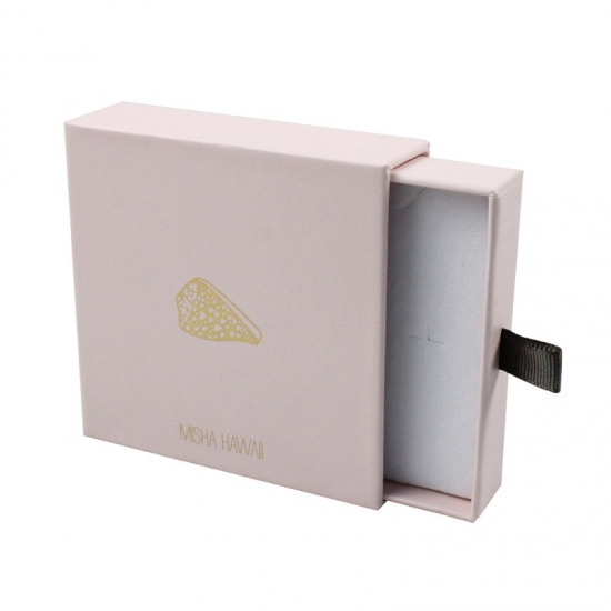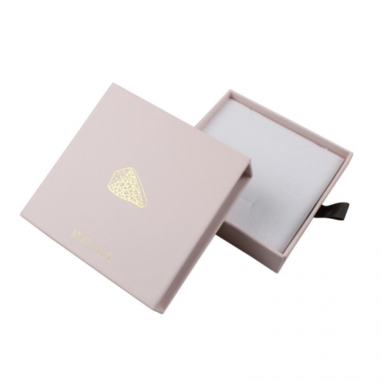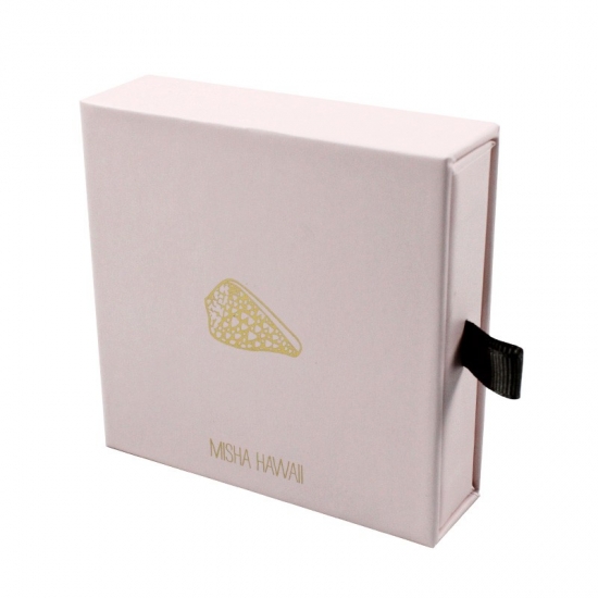 Je to růžová krabice se zásuvkami s natahovačem pásky který dělal z uměleckého papíru C2S 157 g + šedého kartonu 1200 g Logo na horní straně krabice je vyraženo fólií, uvnitř krabice je pěnový kryt se sametovou výplní.