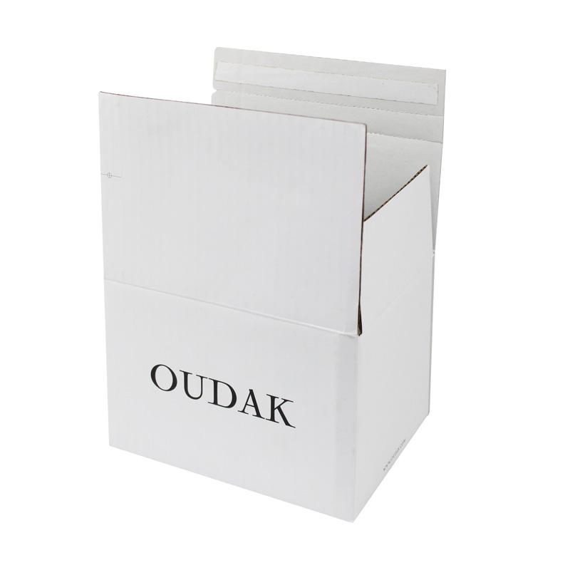 Fantazie Poštovní schránky Easy Seal Vyrobeno z 300gsm² CCNB laminované třívrstvou bílou vlnitou lepenkou. Vnější strana s černým potiskem loga s matným povrchem, uvnitř obyčejný bílý karton s oboustrannou lepicí páskou. Krabici lze snadno uzavřít samolepicí páskou a snadno otevřít díky perforované lince.