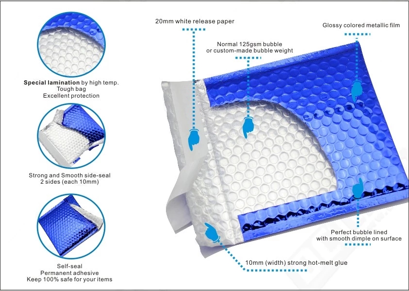 Materiál výrobku: hliníkovaná fólie + polyethylenová bublina. Barvu hliníkované fólie lze přizpůsobit a lze také přizpůsobit obsah potisku.
