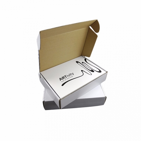 Velké poštovní krabice z kartonu na zakázku, zvenku hnědé s bílým logem a bílým UV lakem, uvnitř bílý potisk s černým LOGEM.