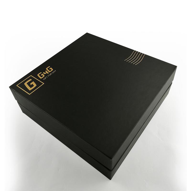 Tato krabice je vyrobena z uměleckého natíraného papíru o gramáži 157 g/m² a 2mm šedého kartonu. Je velmi pevná a robustní. Její rozměry jsou 23*23*8 cm a s hedvábnou látkovou vložkou vypadá luxusněji.