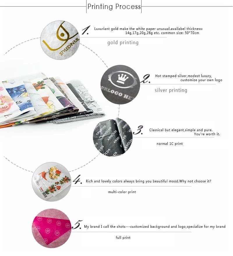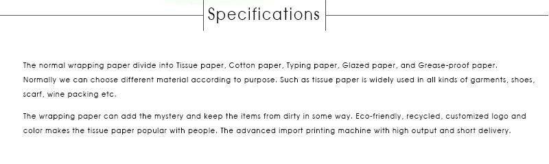 Standardní velikost hedvábného papíru je přibližně 15'' x 20'' nebo 20'' x 30''. Velikost lze upravit na míru. |