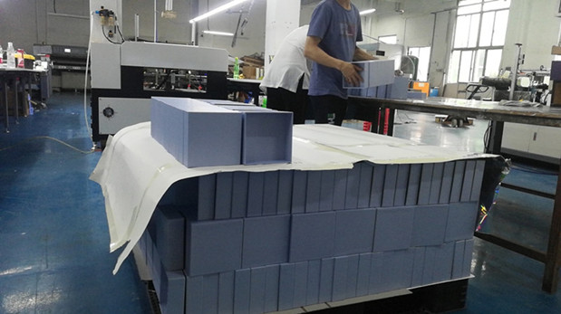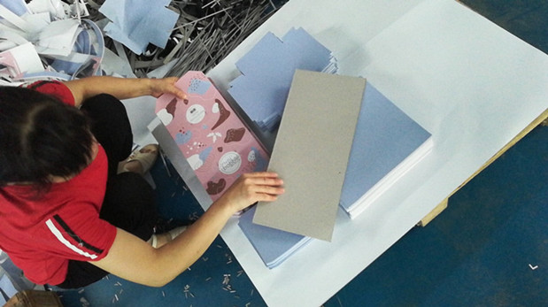 Po tisku a ochraně fólií bude papír vyřezán dle struktury krabice. S pomocí stroje naši zkušení řemeslníci papír osadí prémiovou pevnou lepenkou.
