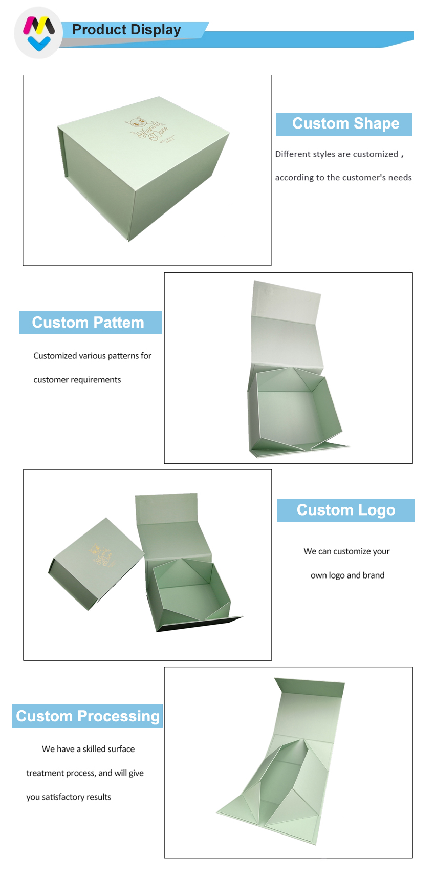 Toto je zelená barva skládací papírové krabice který dělal 157g umělecký papír C2S + 1200g šedá lepenka, plnobarevný tisk na vnější i vnitřní straně krabice s vyraženým logem zlatou fólií.