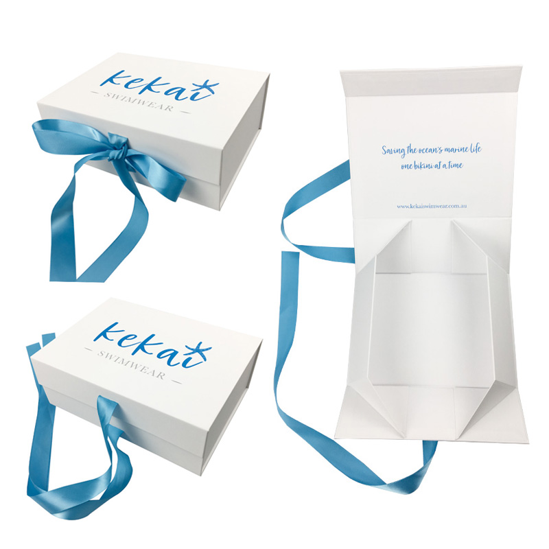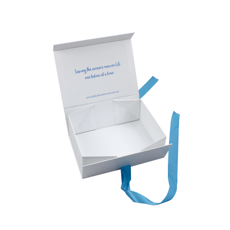 Toto je skládací magnetické dárkové krabičky který dělal 157g umělecký papír + 1200g šedá lepenka, logo na vnější straně krabice a přiložená stuha s modrou barvou loga, uvnitř víka vytištěny pokyny k produktům. Můžeme přizpůsobit velikost dle vašeho požadavku.