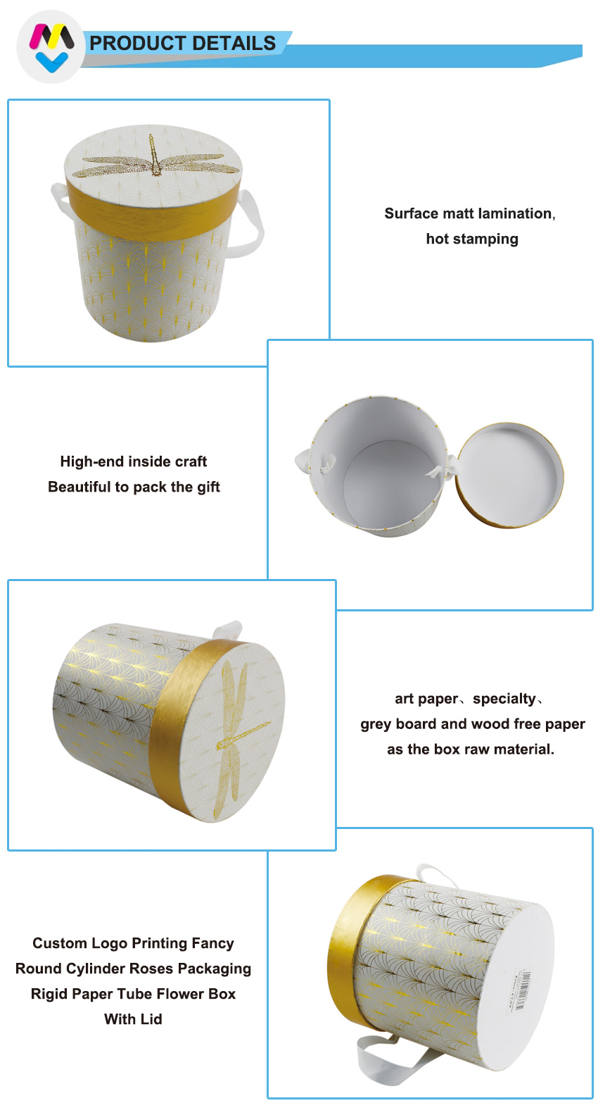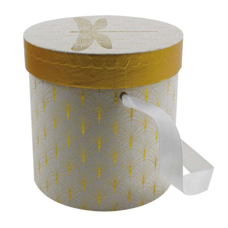 Jedná se o velkou dekorativní kulatou dárkovou krabičku s nádhernými vzory v horní a spodní části, vyrobenou z 157g uměleckého papíru C2S a 1200g šedé lepenky. Na víku je LOGO vážky, které krabičku dodává realistický vzhled, a s stužkovým uchem pro snadné odebírání.