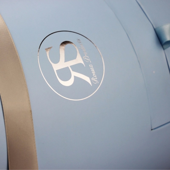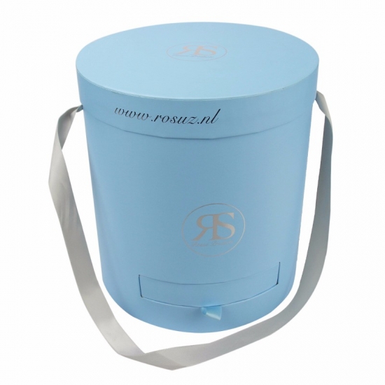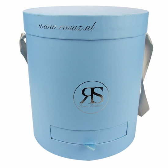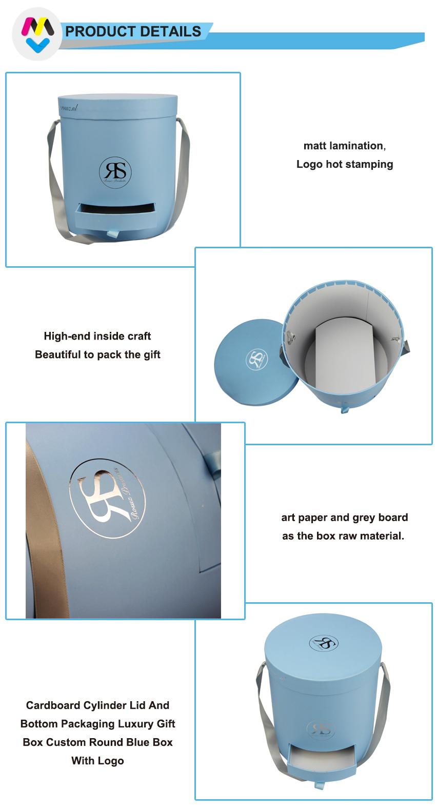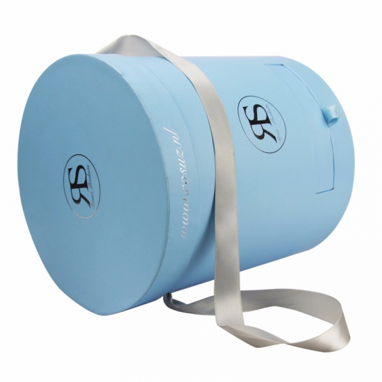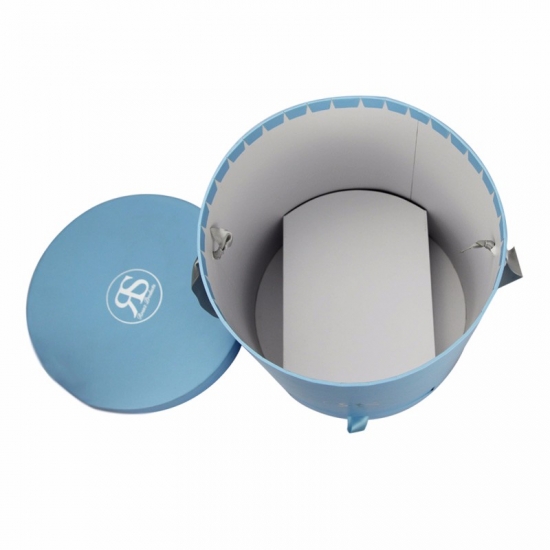 Vlastní světle modré LOGO ražba stříbrnou fólií Kulaté papírové krabice s víkem a malou zásuvkou s rukojetí pro přenášení.