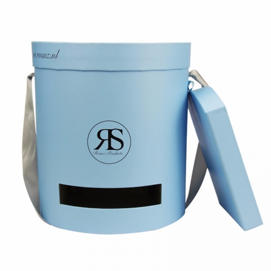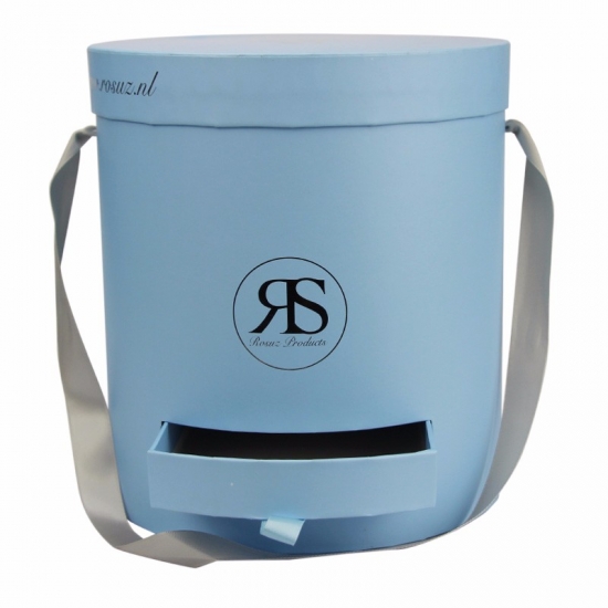 Světle modré kulaté papírové krabice s víkem a malou zásuvkou