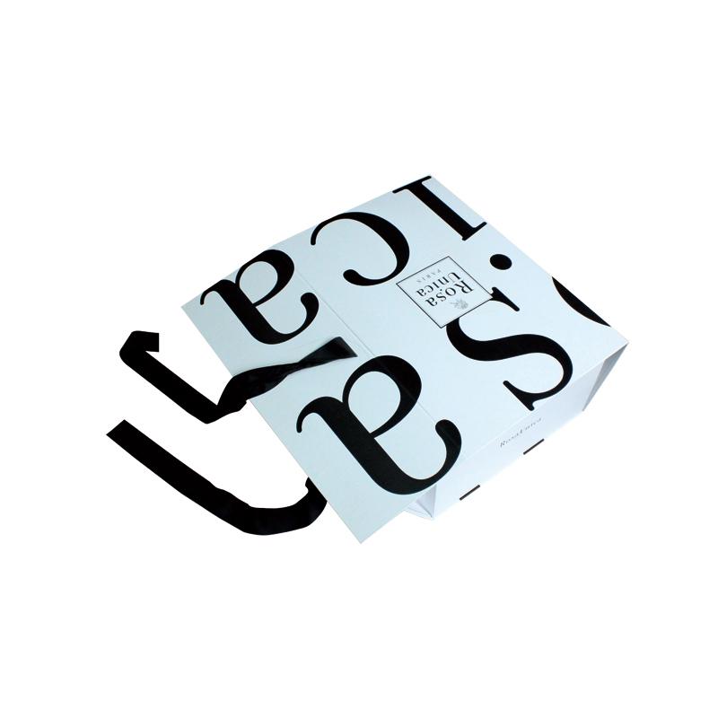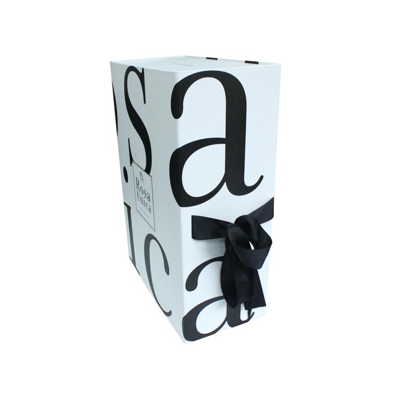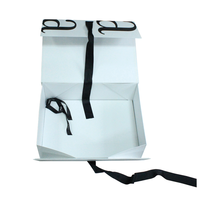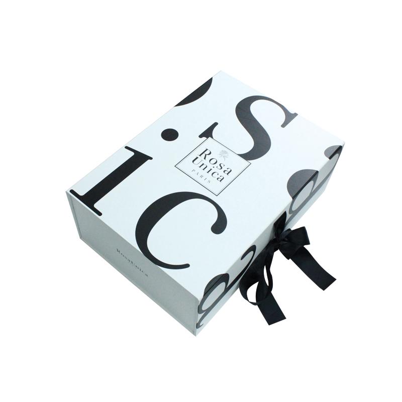 Toto je Skládací dárková krabička A4 se stuhou s černým logem vytištěným na bílém pozadí se stuhou. Vynikající design obalu