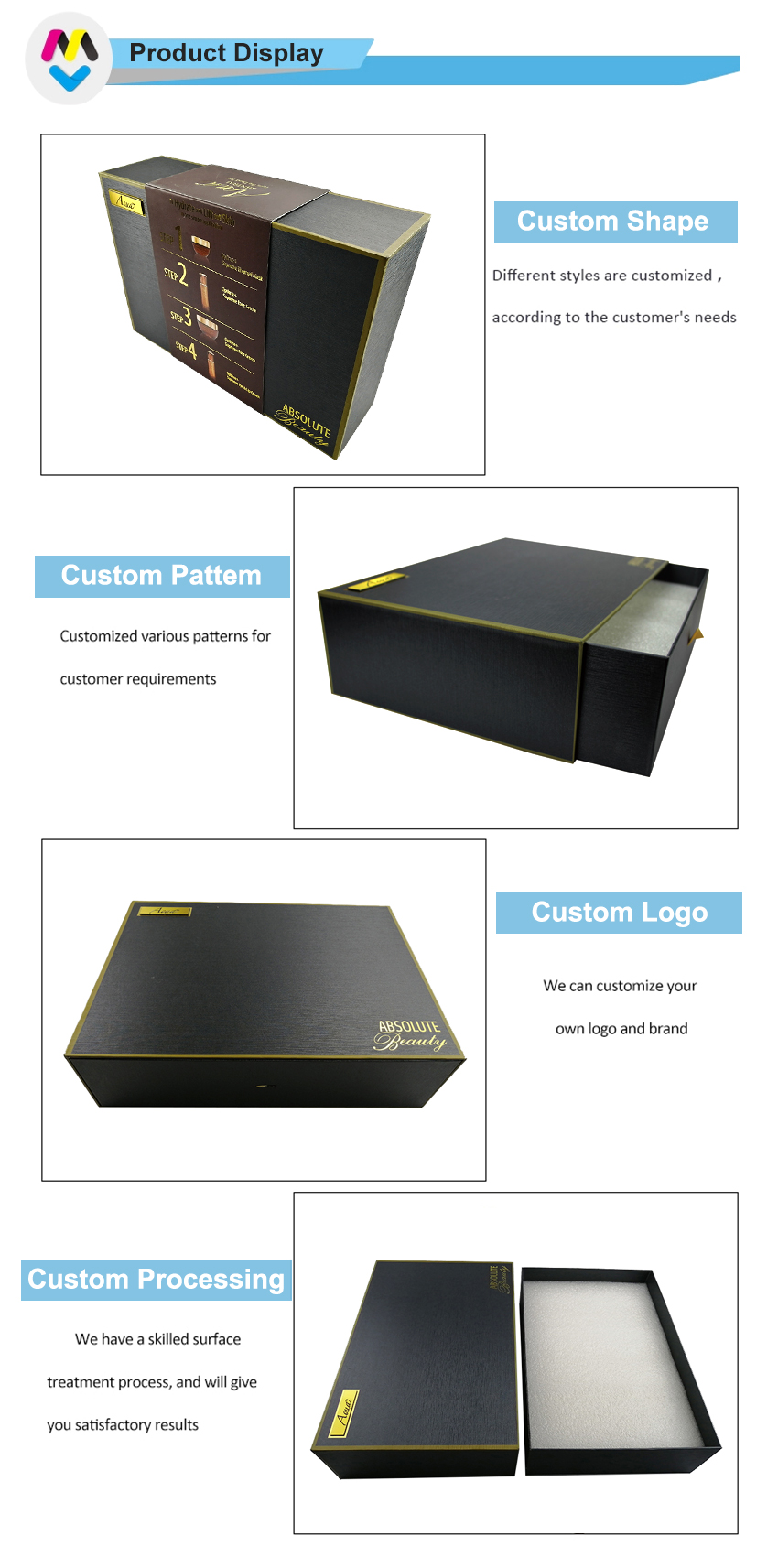 Toto je špičková černá magnetická krabička vyrobeno s černým speciálním papírem na obličej. Jeho textura je velmi speciální, aby byl obal vašeho produktu ještě výraznější.