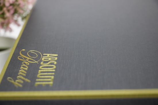 Krabička na bílou čokoládu na míru s plastovou PVC dělicí vložkou, logem vyraženým zlatou fólií na vnějším obalu, vložkou uvnitř krabičky přizpůsobenou v mnoha malých kulatých tvarech podle velikosti čokolád.