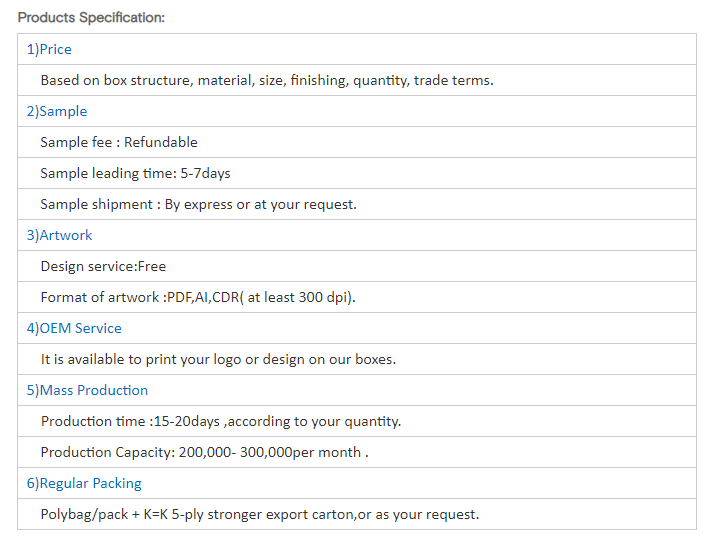 Vezměte prosím na vědomí, že všechny obrázky produktů, které jsme zveřejnili na našich webových stránkách, slouží pouze pro vaši informaci o tom, jaké druhy obalů dokážeme vyrobit, neznamená to, že prodáváme stejné jako skladem. Papírové obaly v jakékoli velikosti/barevném tisku/strukturě lze vyrobit na míru.