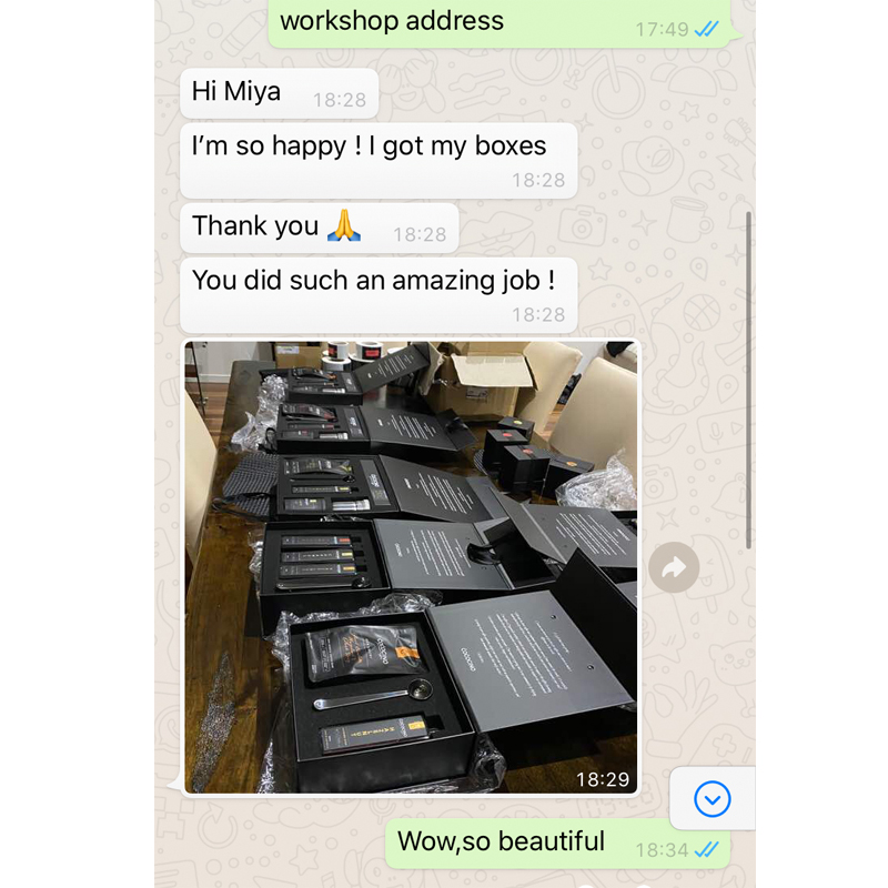 Měla velkou radost, když obdržela naše sériově vyráběné magnetické dárkové krabičky se stuhou. Byla nadšená, že luxusní magnetické dárkové krabičky byly krásnější než vzorky, a věřila, že perfektní balení zajistí, že se její výrobky budou dobře prodávat. Jsem si jistá, že se jí tyto výrobky brzy podaří prodat. Jsme velmi rádi, že jsme obdrželi její souhlas a uspokojivou zpětnou vazbu k potvrzení našeho produktu. Doufáme, že se zde setkáte s dalšími přáteli, vítejte a dozvíte se více informací o dárkových krabičkách na míru.