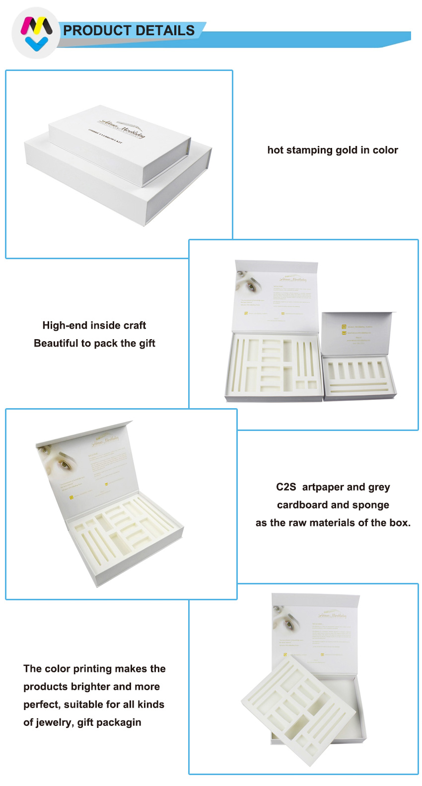 Toto je balicí krabice s přepážkami který dělal Logo na horní straně krabice je vyrobeno z uměleckého papíru C2S 157g + šedé lepenky 2mm, je vyrobeno z fólie s různobarevným ražením, díky čemuž vypadá krabice leskle a luxusně, vnitřní výplň krabice je z bílé houby se sametem na míru.
