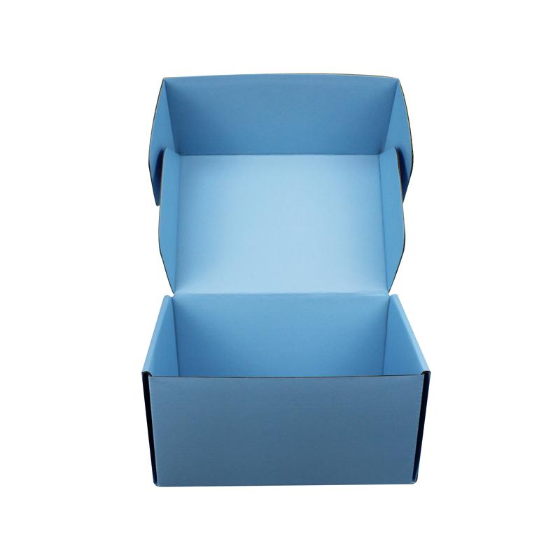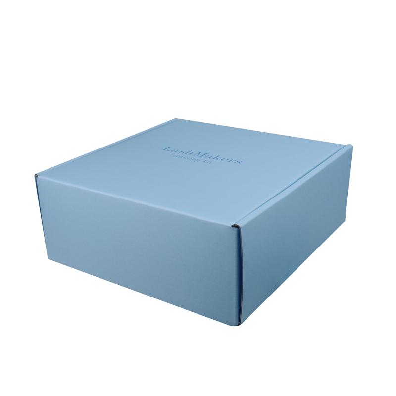 Tento Plochá přepravní krabice Je vyroben z 300gsm² CCNB papíru s vyztuženým E-vlnným profilem a uvnitř je 300gsm CCNB papír. Vnější i vnitřní strana je potištěna modrou barvou Pantone s tmavě modrým logem vyraženým do hloubky.