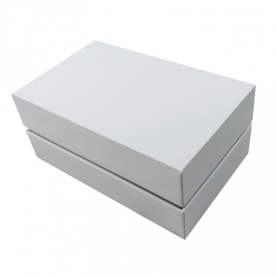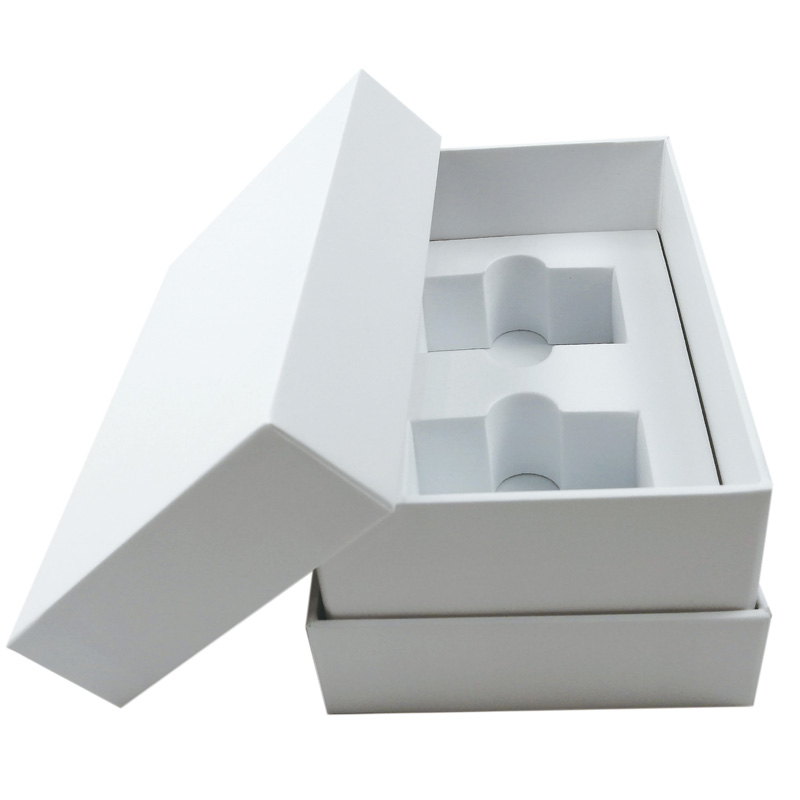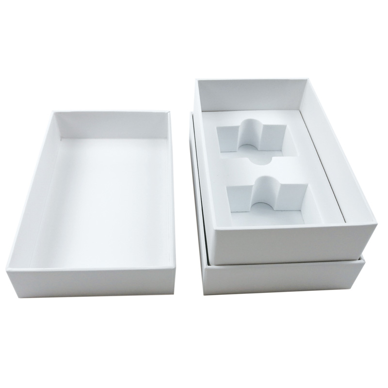 Toto je bílý karton s víčkem krabice který dělal Z uměleckého papíru C2S 157g + šedého kartonu 1200g, základna s manžetou, uvnitř krabice je na míru tvarovaná bílá výplň z EVA.