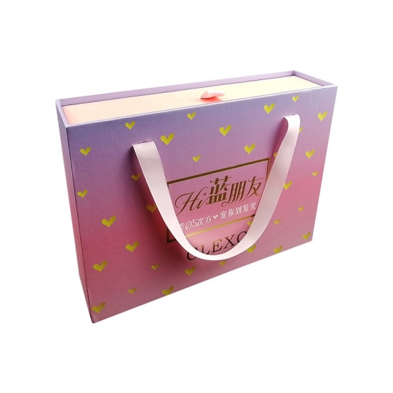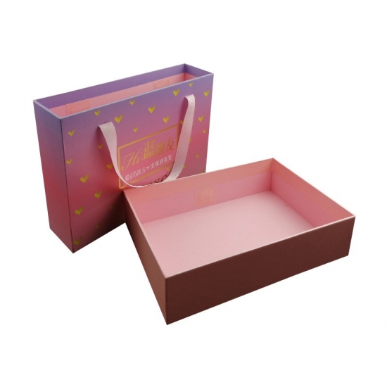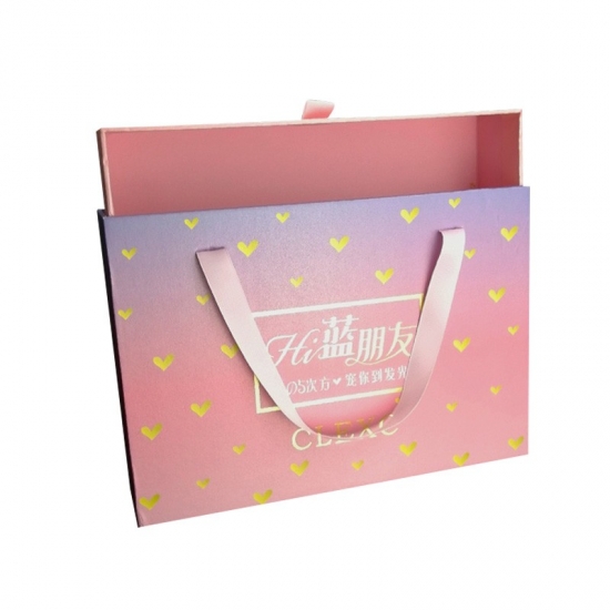 Je to růžová velká posuvná zásuvková romantická dárková krabička s mašlovou rukojetí který dělal z uměleckého papíru C2S 157 g + šedého kartonu 1200 g ,vně krabice potisk s plným grafickým vzorem, základní krabice jednobarevný růžový potisk s matnou povrchovou úpravou.