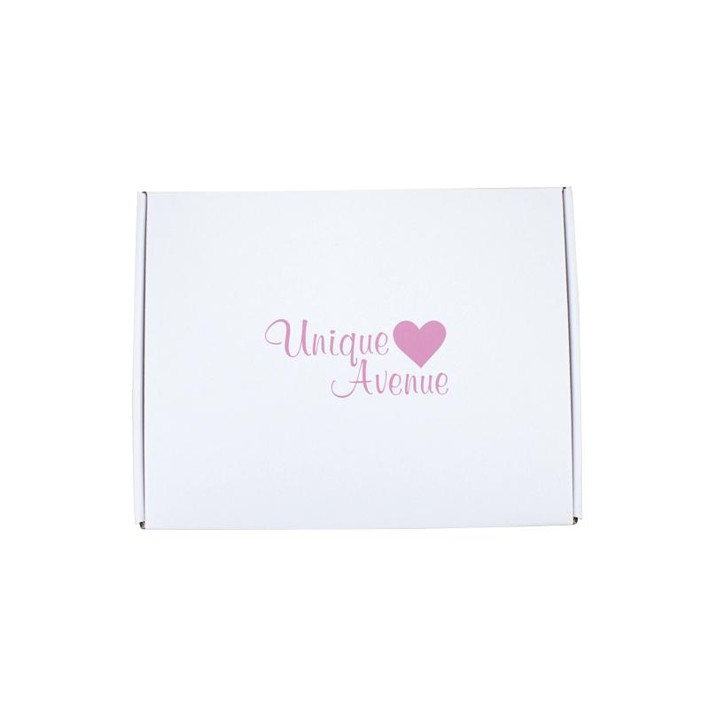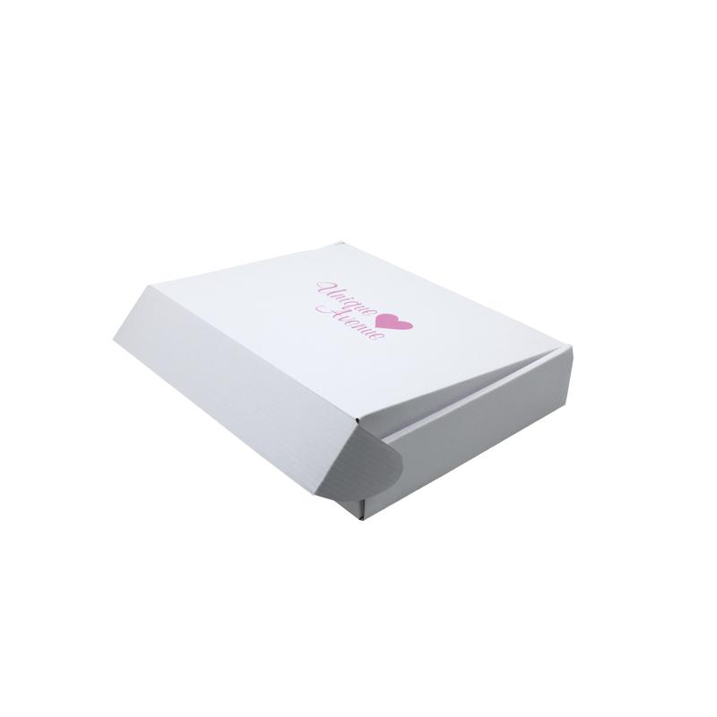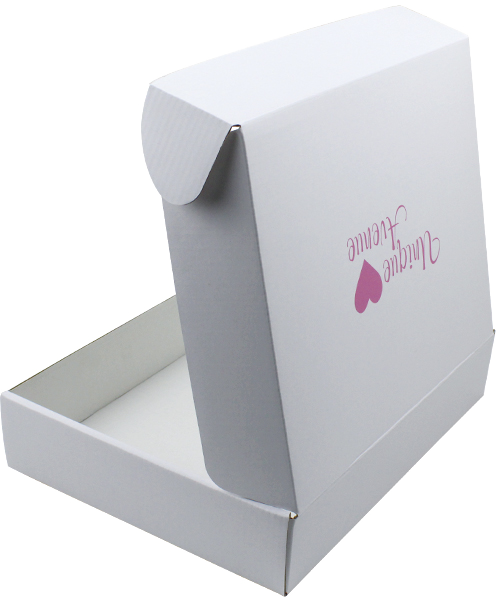 Jedná se o bílou třívrstvou vlnitou krabici vyrobenou z 300g CCNB+WE vlnité lepenky, lze ji balit do plochých poštovních krabic. Logo je růžového tisku uprostřed horní části krabice.