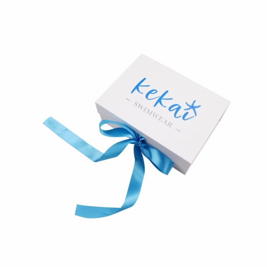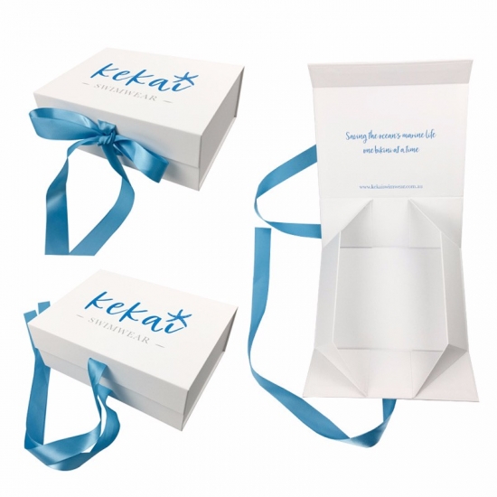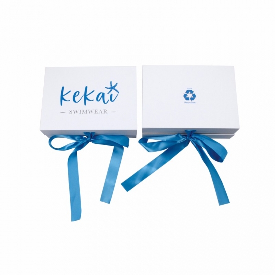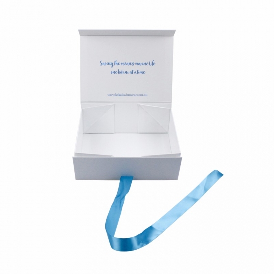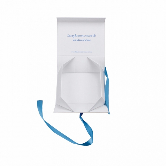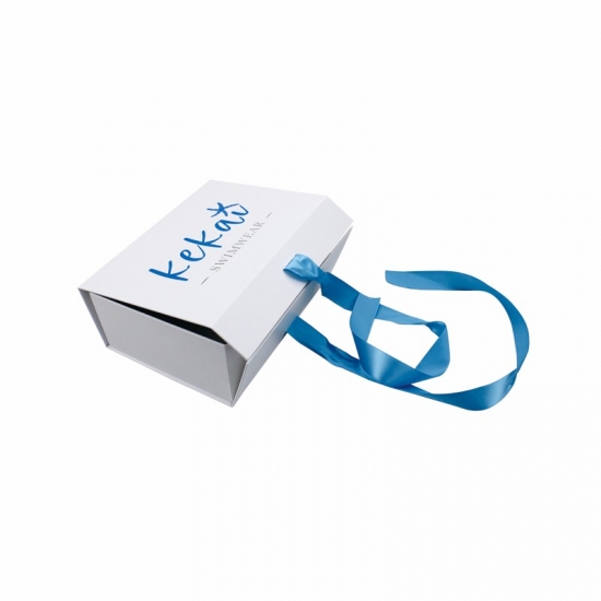 Toto je matně modrá barva skládací magnetické dárkové krabičky který dělal 157g umělecký papír C2S + 1200g šedá lepenka, vlastní modré logo a branding na vnější i vnitřní straně krabice se stuhou, která barva odpovídá barvě loga.