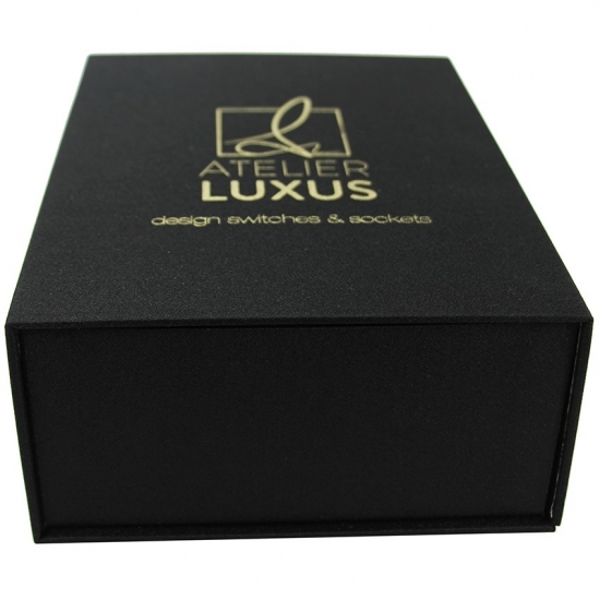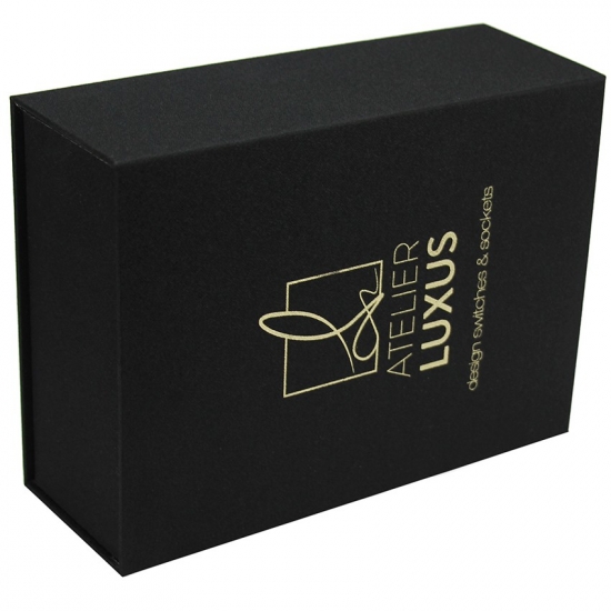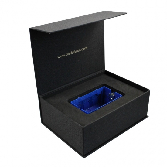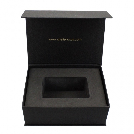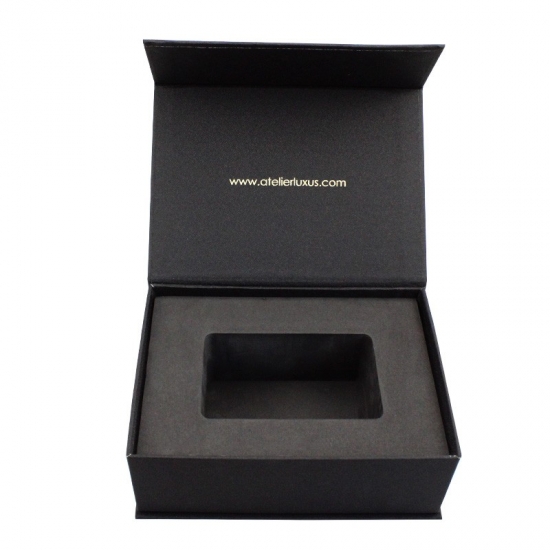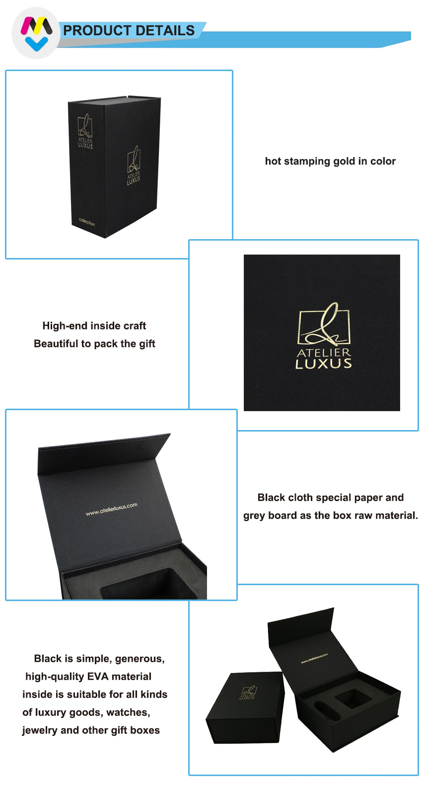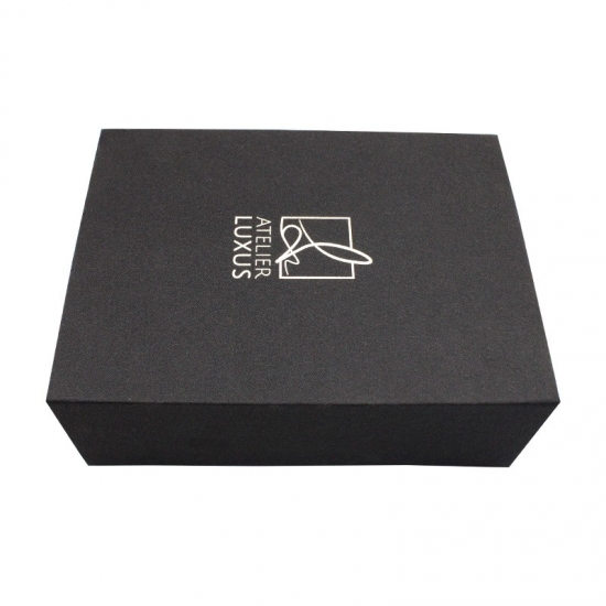 Černá dárková krabička s překlápěním byla vyrobena z uměleckého papíru C2S o gramáži 157 g/m², laminovaného 2mm šedou lepenkou s EVA pěnovou podporou, přizpůsobenou libovolné velikosti, jakékoli barvě a logu. Povrchová úprava byla matná laminace, horká ražba. Velikost 21*15,5*7,5 cm.